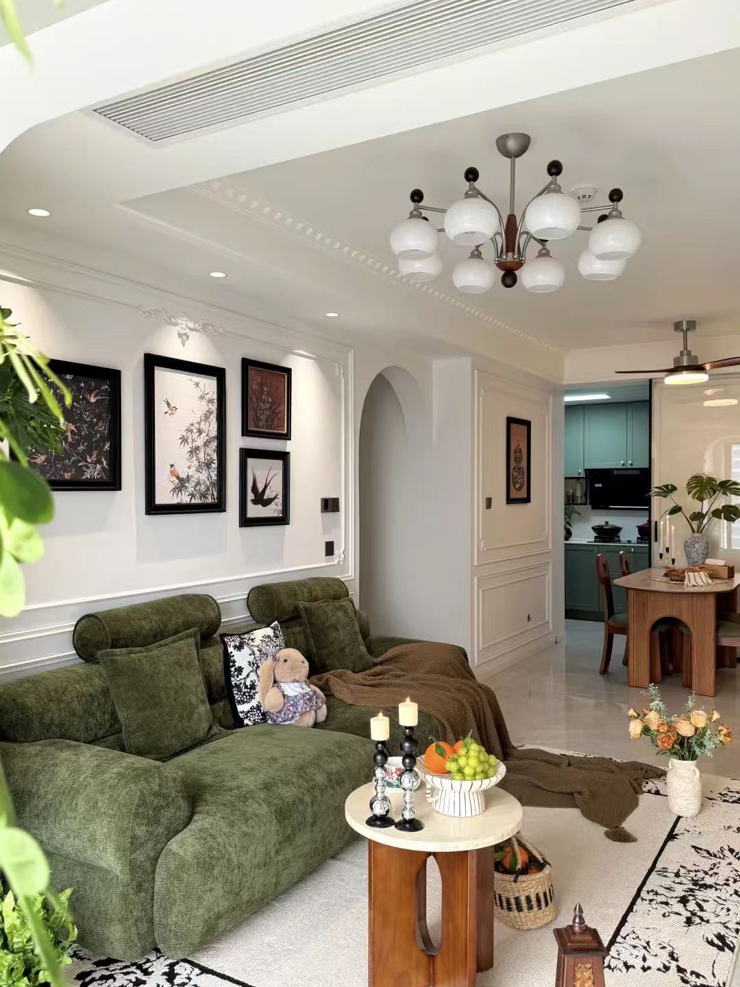 建面95㎡套内70㎡三房两厅两卫。大厅被奶白 + 深木色 + 橄榄绿的温柔色调包裹,中古风的复古线条与现代收纳完美融合。 深棕红的复古门型,搭配智能门锁,质感沉稳,与中古风调性完美契合。 玄关处大白墙,用洞洞板+全身镜拯救了! 既是绿植展示区,也是杂物收纳区,电表箱也完美隐藏,让玄关充满生活气息与自然感。 厨房冰箱与鞋柜高柜背靠一体,通顶设计不仅打通了空间动线,更让紧凑的小厨房成功严丝合缝塞下双开门大冰箱,每一寸角落都被高效利用。 砸掉原始L 形墙,将厨房门换个方向,装上轻盈的吊轨玻璃推拉门。门一推开,厨房、餐厅、客厅瞬间连成一片,小家秒变通透敞亮。 客餐厅整面墙做到顶天立地,左侧做了弧形开放格,中间嵌入电视,下方是抽屉 + 开放格组合,既保证了收纳容量,又避免了压抑感。 8㎡的主卧内灯笼吊灯暖光柔和。碎花床品 + 荷叶边床裙自带慵懒感,搭配白纱帘与百叶窗,光影朦胧浪漫。 儿童房极致利用,休息 + 学习 + 储物一步到位!借用80cm 飘窗做带超大抽屉榻榻米床,拿取不掀床垫,床头叠柜收纳过季衣物。 主卫用600×1200 墙砖对缝铺贴,缝隙少、整体感强,空间不乱。哑光纯白铝扣板吊顶,性价比高又大气。淋浴区做下沉式设计,颜值高、好打理。通顶镜柜扩容又能装,台面清爽。悬空浴室柜无卫生死角,扫地机自由进出。 从通透的客餐厅一体到治愈的法式中古风卧室,每一寸空间都写满温柔与烟火气。
