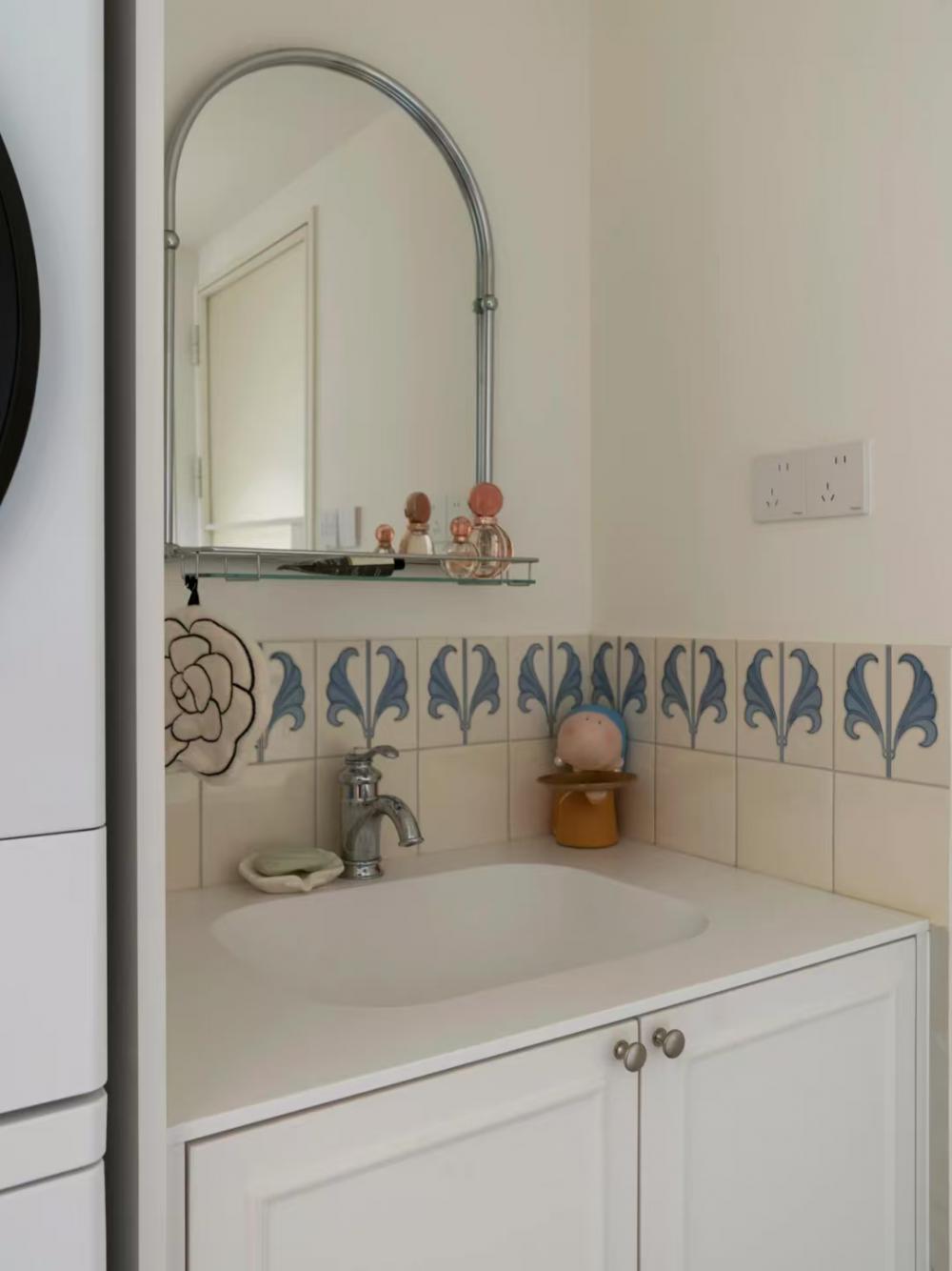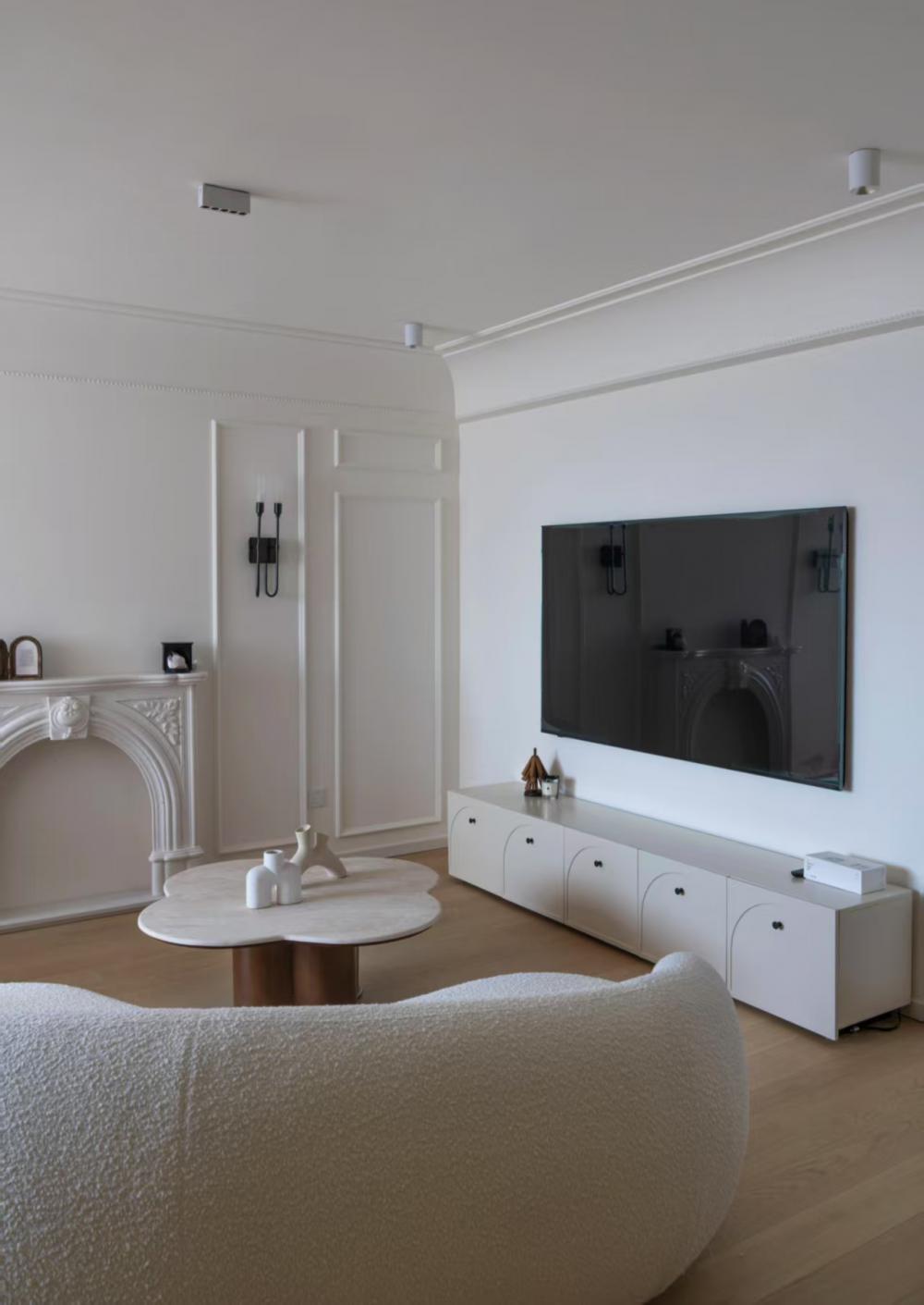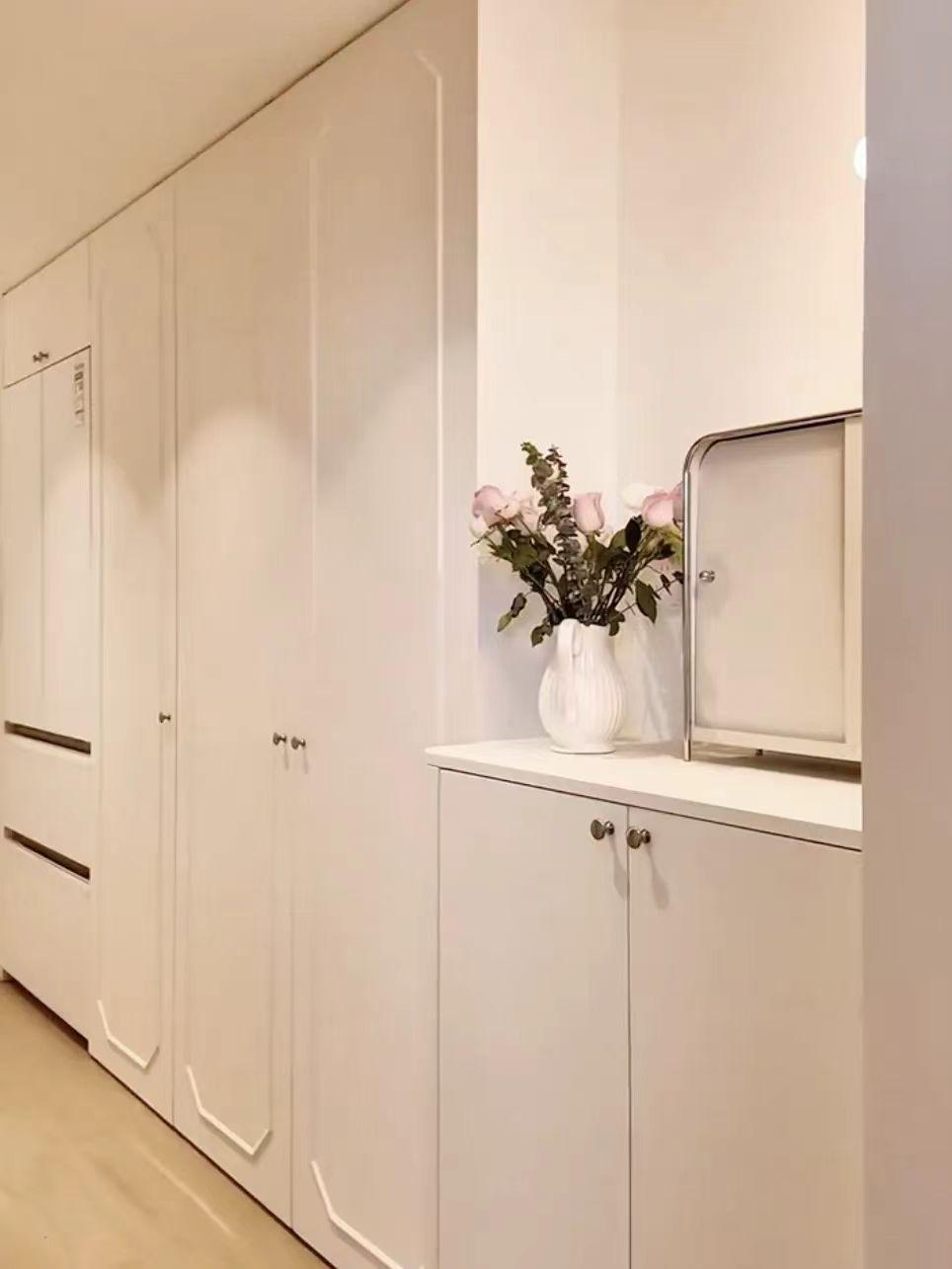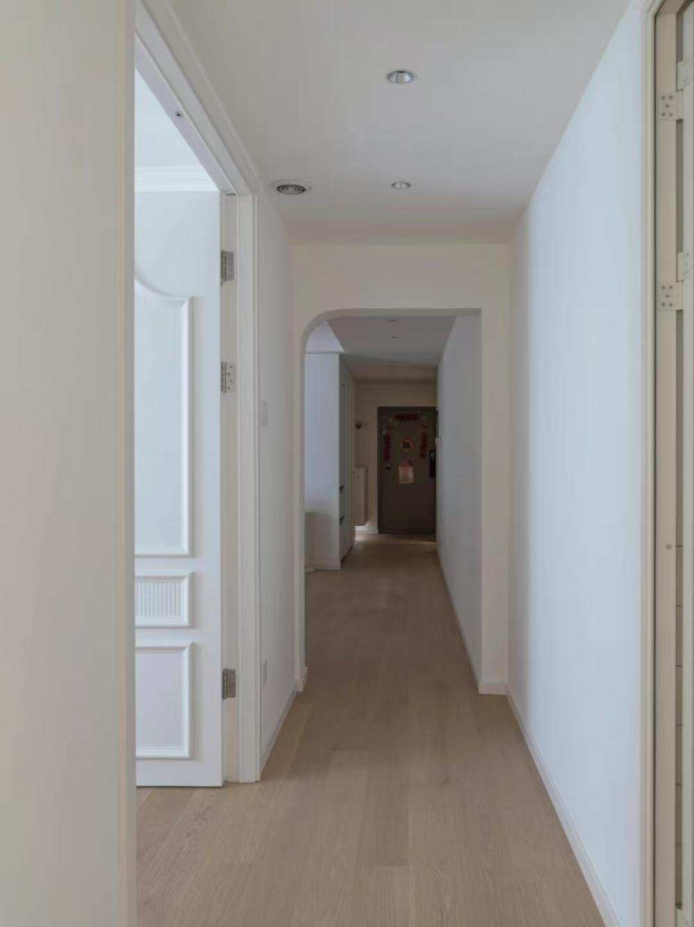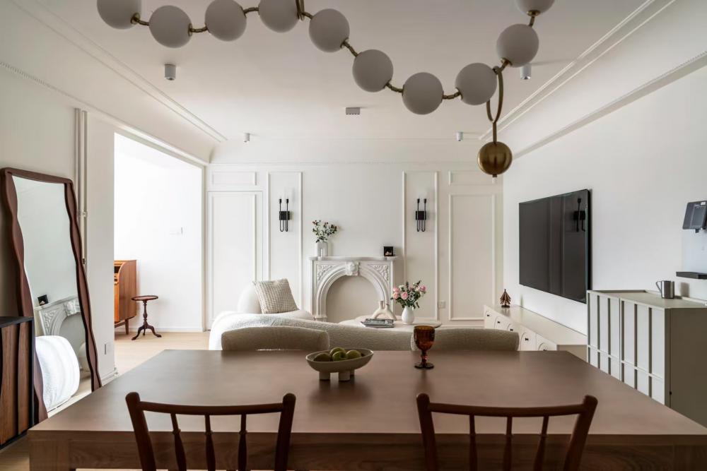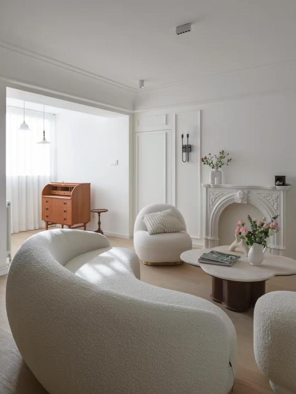 一进门就是走廊式收纳,以实用为主,新加了3.5米的长柜子,依次是透气的壁挂中柜,用来收纳通勤的鞋子以及外出杂物。 厨房中间是烹饪区,右边是烤箱等电器柜,洗切炒一气呵成,厨房的大小也足够2个人同时操作 右边的电器区墙上也预留了电力轨道,方便小家电的使用。整个橱柜都是纯白的,显得空间敞亮。 往里走是宽敞的餐客厅,慢慢的法式风扑面而来。 餐区很大,两侧都安排半柜的情况下,放1米8的大桌也很宽敞。 整体的设计,按照业主的生活需求来,一侧安排管线机和饮水用具。 柜和旁边的镜子都是比餐桌更深的樱桃木色,有层次,实用性足够,与整体的风格一致。 客厅与餐区一体,通过视线划分空间,曲线围合的沙发和区域划分让每个功能区虽处在一个空间,却有独立的视觉感受。 客厅左边是原来的阳台,扩充客厅空间感,简单陈列了复古柜子,增强尽端的仪式感。 客厅正中央的墙面则留给了壁炉,是所有视线的中心,绝对对称,非常貌美。 客厅右边则是电视柜,因为是围合的曲线沙发,搭配单人位,看电视也是正视角,不会有斜视的不适感。 主卧功能也很完善,除了储物空间,还有独立休息区和观影功能。 餐客厅另一侧的走廊通往书房和次卧,书房改成双开门,更通透明亮。 书房里做了整墙书柜、阅读区和两人使用的书桌。女业主平时很喜欢在这里休息看书。 次卧目前业主没怎么用,保留了基础功能,为以后的儿童房使用做准备。整面衣柜设计,左边两扇还藏了一个小仓库,收纳容量充沛。 主卫地面是粉白色的小花砖,墙面贴了粉色方砖,半墙拼色,粉粉糯糯。 客卫改变了入口方向,并拓宽了一部分餐厅面积作为洗衣区和盥洗区。洗手台延续了主卫配色,在洗手池局部贴了一圈粉色挡水条。