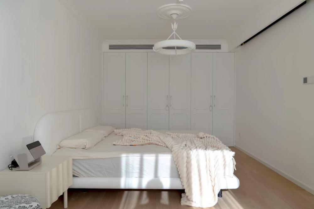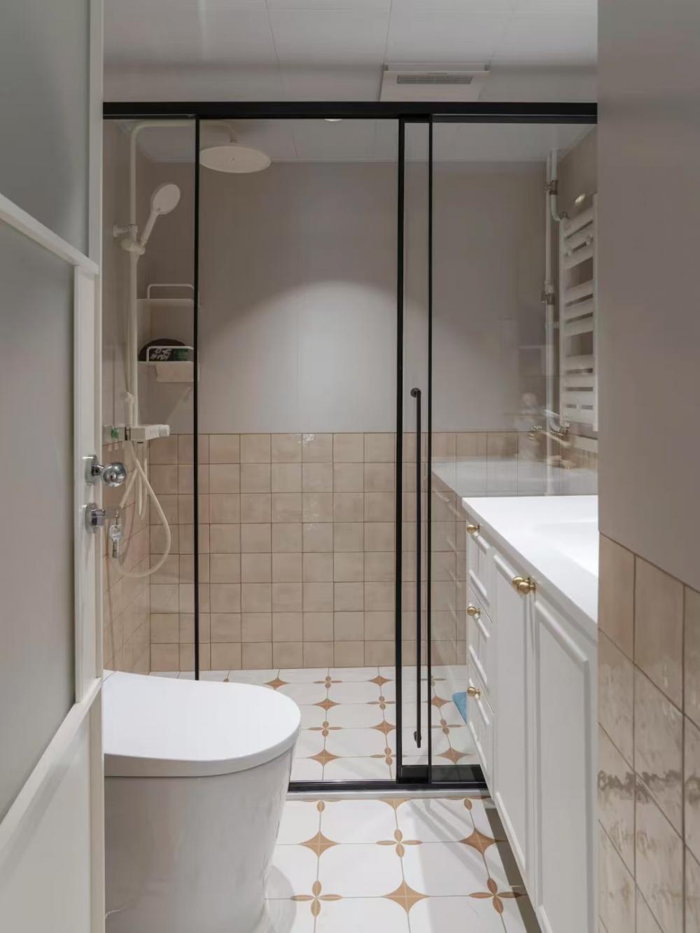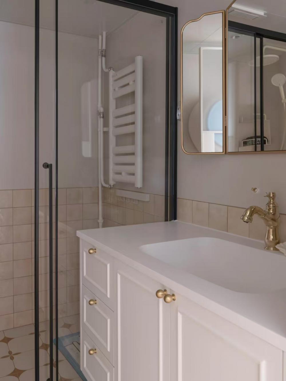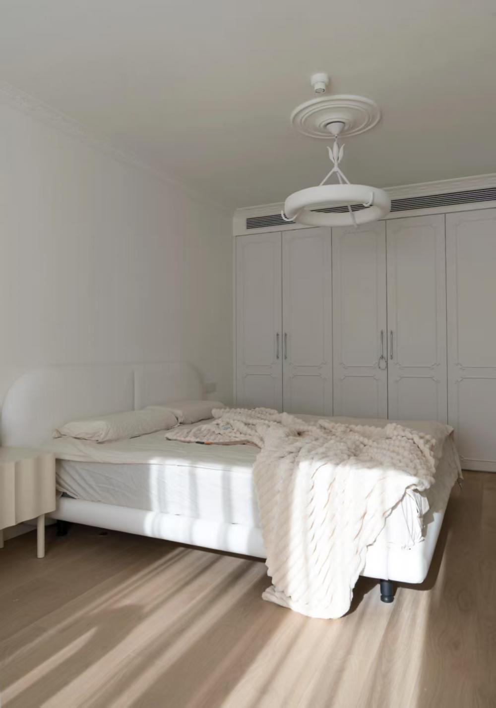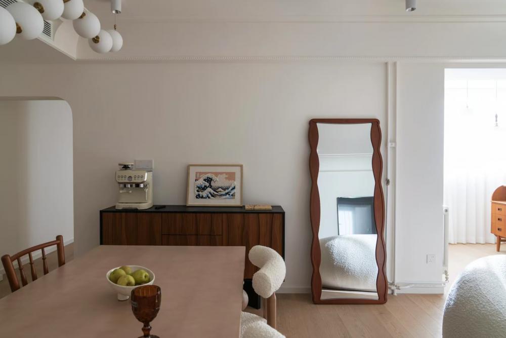 一进门就是走廊式收纳,以实用为主,新加了3.5米的长柜子,依次是透气的壁挂中柜,用来收纳通勤的鞋子以及外出杂物。 厨房中间是烹饪区,右边是烤箱等电器柜,洗切炒一气呵成,厨房的大小也足够2个人同时操作 右边的电器区墙上也预留了电力轨道,方便小家电的使用。整个橱柜都是纯白的,显得空间敞亮。 往里走是宽敞的餐客厅,慢慢的法式风扑面而来。 餐区很大,两侧都安排半柜的情况下,放1米8的大桌也很宽敞。 整体的设计,按照业主的生活需求来,一侧安排管线机和饮水用具。 柜和旁边的镜子都是比餐桌更深的樱桃木色,有层次,实用性足够,与整体的风格一致。 客厅与餐区一体,通过视线划分空间,曲线围合的沙发和区域划分让每个功能区虽处在一个空间,却有独立的视觉感受。 客厅左边是原来的阳台,扩充客厅空间感,简单陈列了复古柜子,增强尽端的仪式感。 客厅正中央的墙面则留给了壁炉,是所有视线的中心,绝对对称,非常貌美。 客厅右边则是电视柜,因为是围合的曲线沙发,搭配单人位,看电视也是正视角,不会有斜视的不适感。 主卧功能也很完善,除了储物空间,还有独立休息区和观影功能。 餐客厅另一侧的走廊通往书房和次卧,书房改成双开门,更通透明亮。 书房里做了整墙书柜、阅读区和两人使用的书桌。女业主平时很喜欢在这里休息看书。 次卧目前业主没怎么用,保留了基础功能,为以后的儿童房使用做准备。整面衣柜设计,左边两扇还藏了一个小仓库,收纳容量充沛。 主卫地面是粉白色的小花砖,墙面贴了粉色方砖,半墙拼色,粉粉糯糯。 客卫改变了入口方向,并拓宽了一部分餐厅面积作为洗衣区和盥洗区。洗手台延续了主卫配色,在洗手池局部贴了一圈粉色挡水条。