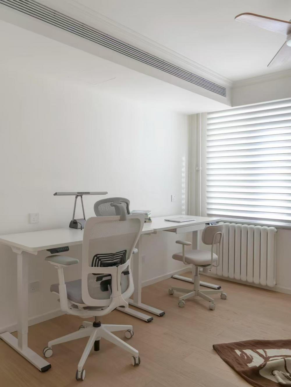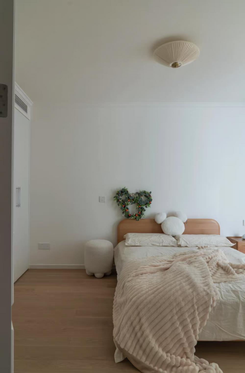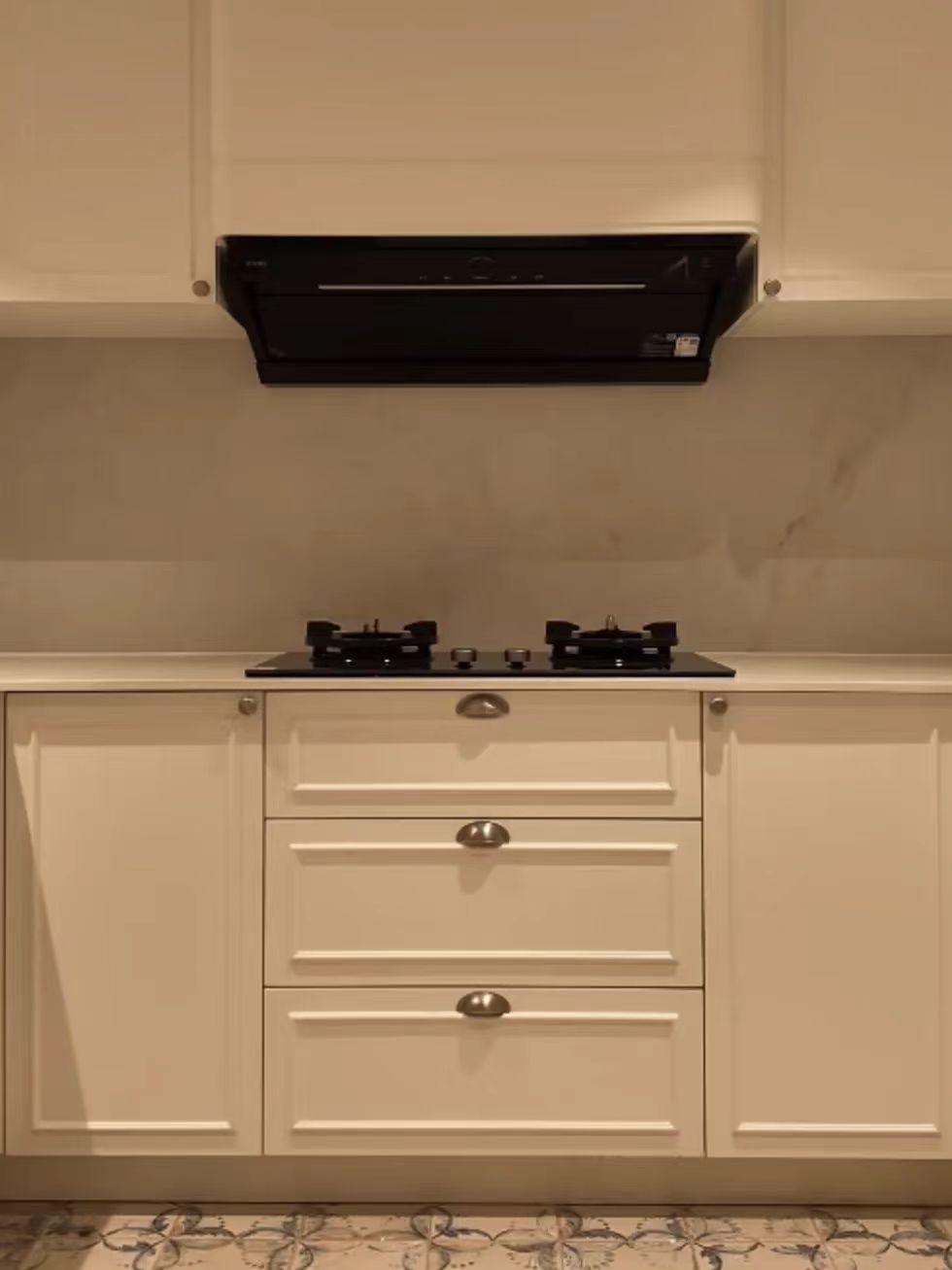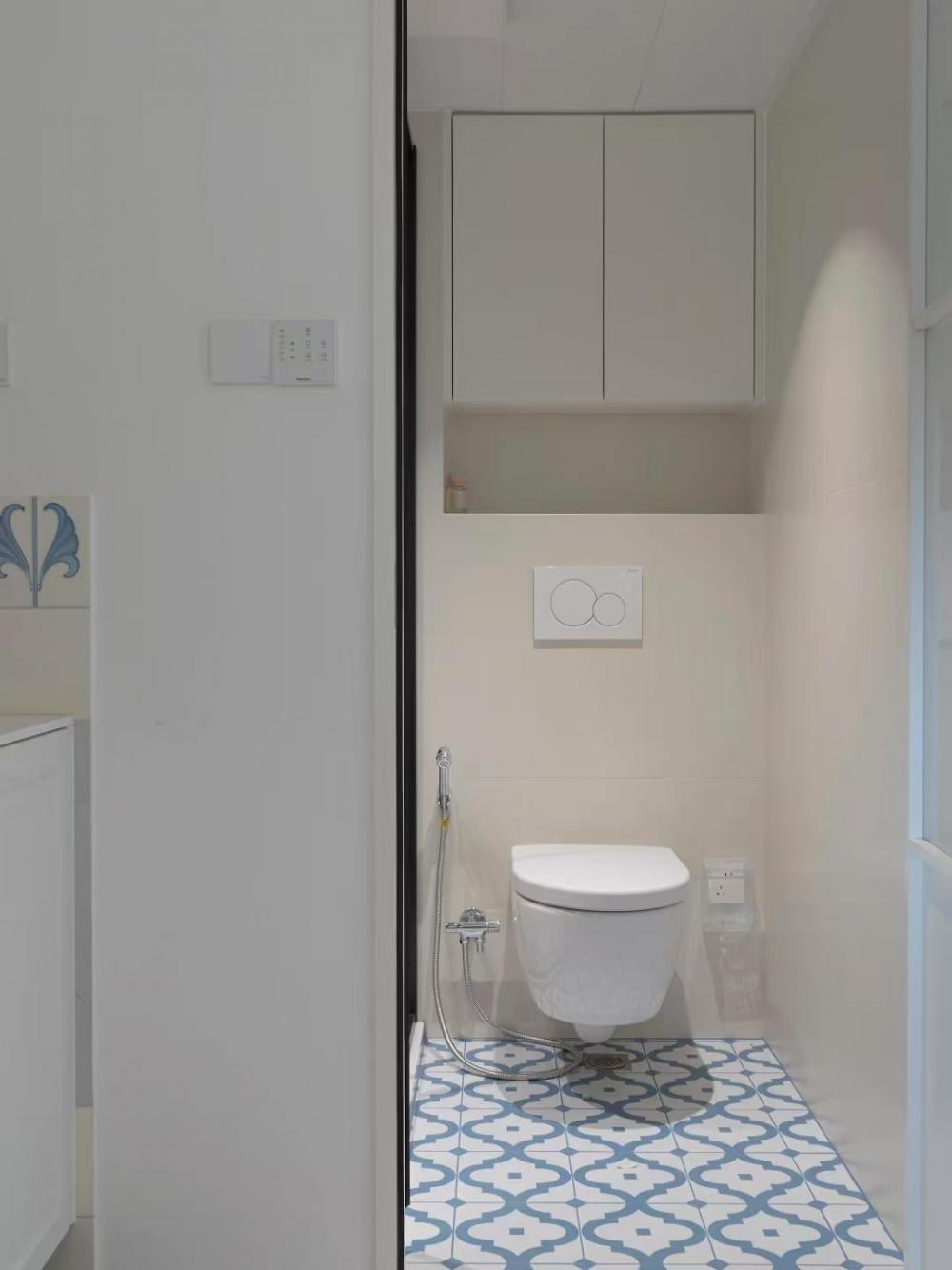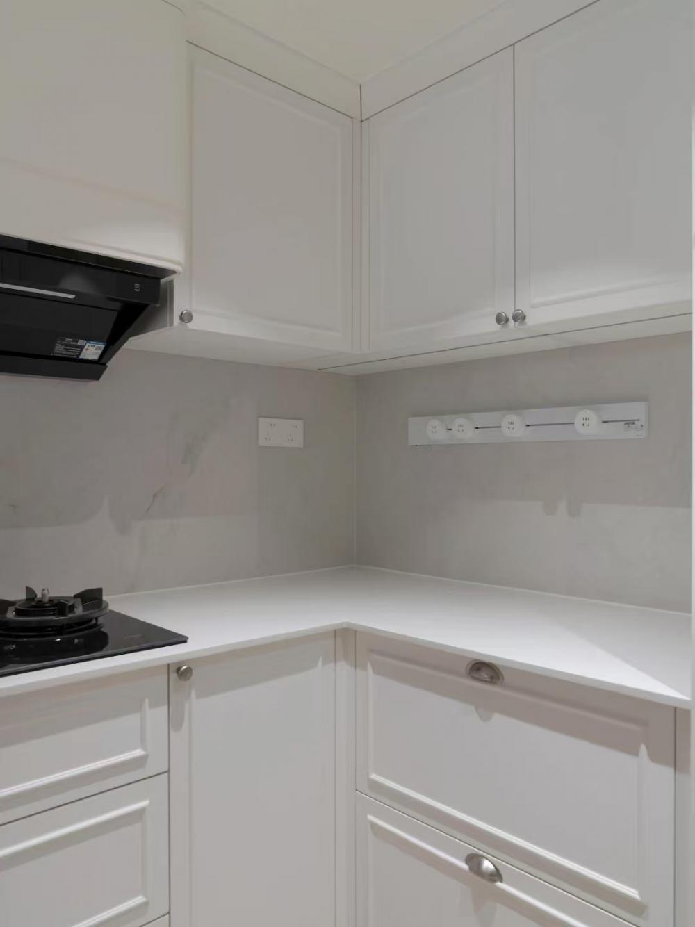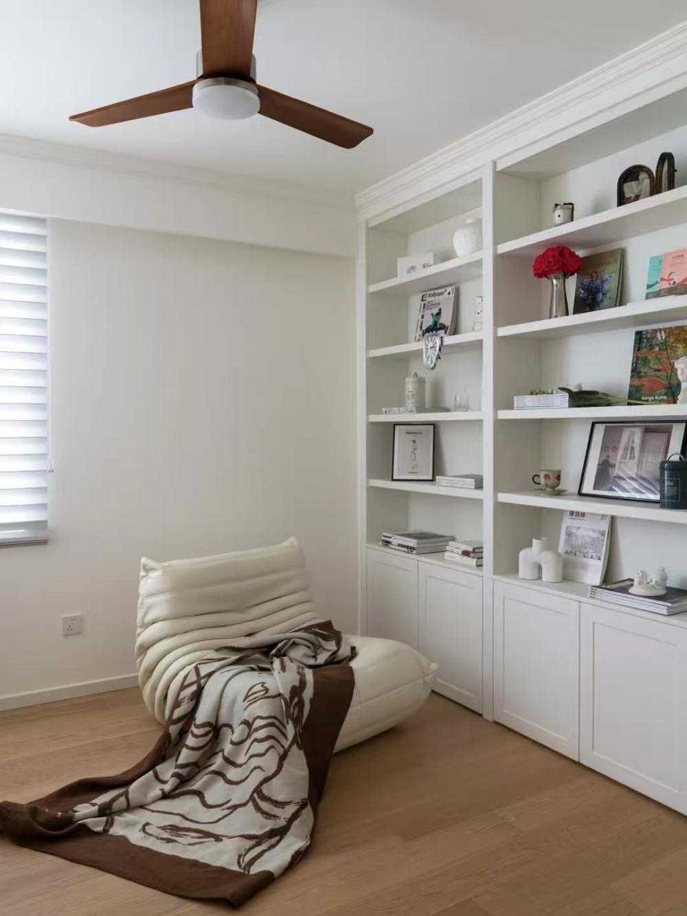 一进门就是走廊式收纳,以实用为主,新加了3.5米的长柜子,依次是透气的壁挂中柜,用来收纳通勤的鞋子以及外出杂物。 厨房中间是烹饪区,右边是烤箱等电器柜,洗切炒一气呵成,厨房的大小也足够2个人同时操作 右边的电器区墙上也预留了电力轨道,方便小家电的使用。整个橱柜都是纯白的,显得空间敞亮。 往里走是宽敞的餐客厅,慢慢的法式风扑面而来。 餐区很大,两侧都安排半柜的情况下,放1米8的大桌也很宽敞。 整体的设计,按照业主的生活需求来,一侧安排管线机和饮水用具。 柜和旁边的镜子都是比餐桌更深的樱桃木色,有层次,实用性足够,与整体的风格一致。 客厅与餐区一体,通过视线划分空间,曲线围合的沙发和区域划分让每个功能区虽处在一个空间,却有独立的视觉感受。 客厅左边是原来的阳台,扩充客厅空间感,简单陈列了复古柜子,增强尽端的仪式感。 客厅正中央的墙面则留给了壁炉,是所有视线的中心,绝对对称,非常貌美。 客厅右边则是电视柜,因为是围合的曲线沙发,搭配单人位,看电视也是正视角,不会有斜视的不适感。 主卧功能也很完善,除了储物空间,还有独立休息区和观影功能。 餐客厅另一侧的走廊通往书房和次卧,书房改成双开门,更通透明亮。 书房里做了整墙书柜、阅读区和两人使用的书桌。女业主平时很喜欢在这里休息看书。 次卧目前业主没怎么用,保留了基础功能,为以后的儿童房使用做准备。整面衣柜设计,左边两扇还藏了一个小仓库,收纳容量充沛。 主卫地面是粉白色的小花砖,墙面贴了粉色方砖,半墙拼色,粉粉糯糯。 客卫改变了入口方向,并拓宽了一部分餐厅面积作为洗衣区和盥洗区。洗手台延续了主卫配色,在洗手池局部贴了一圈粉色挡水条。