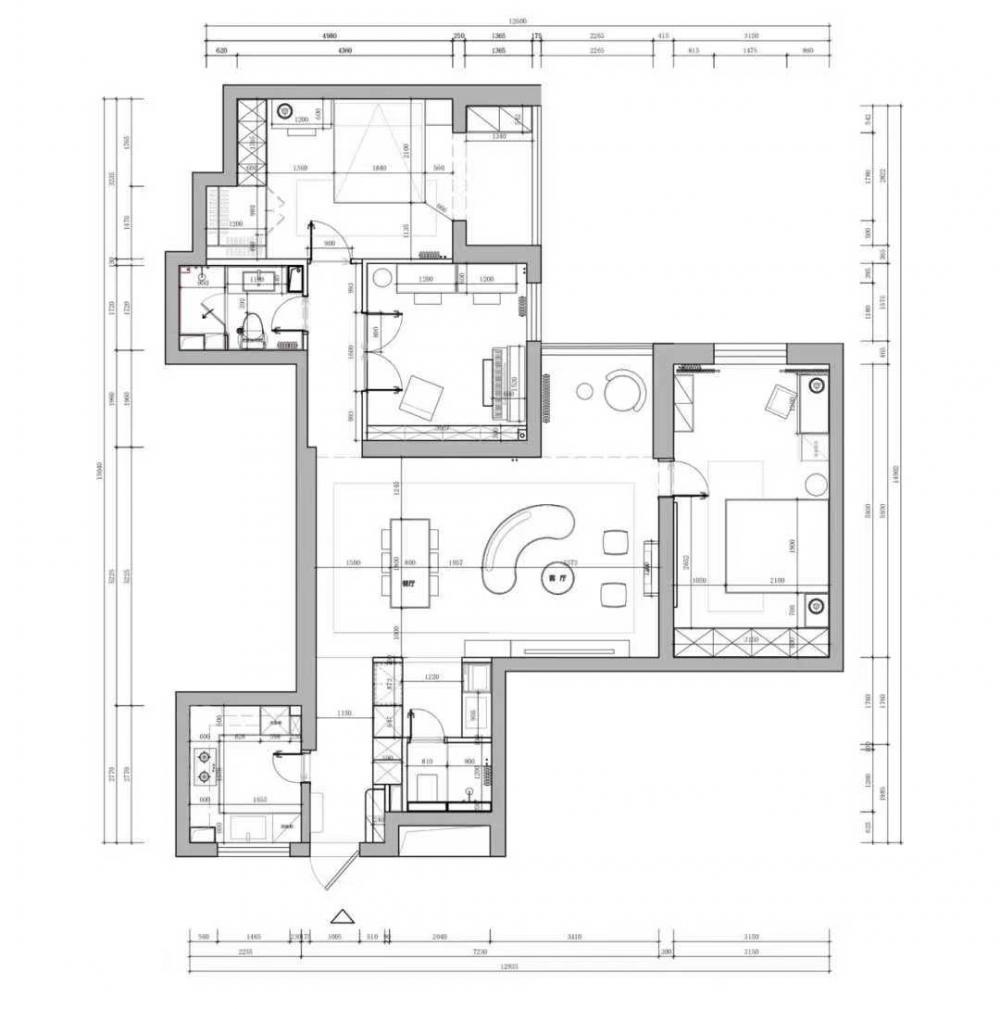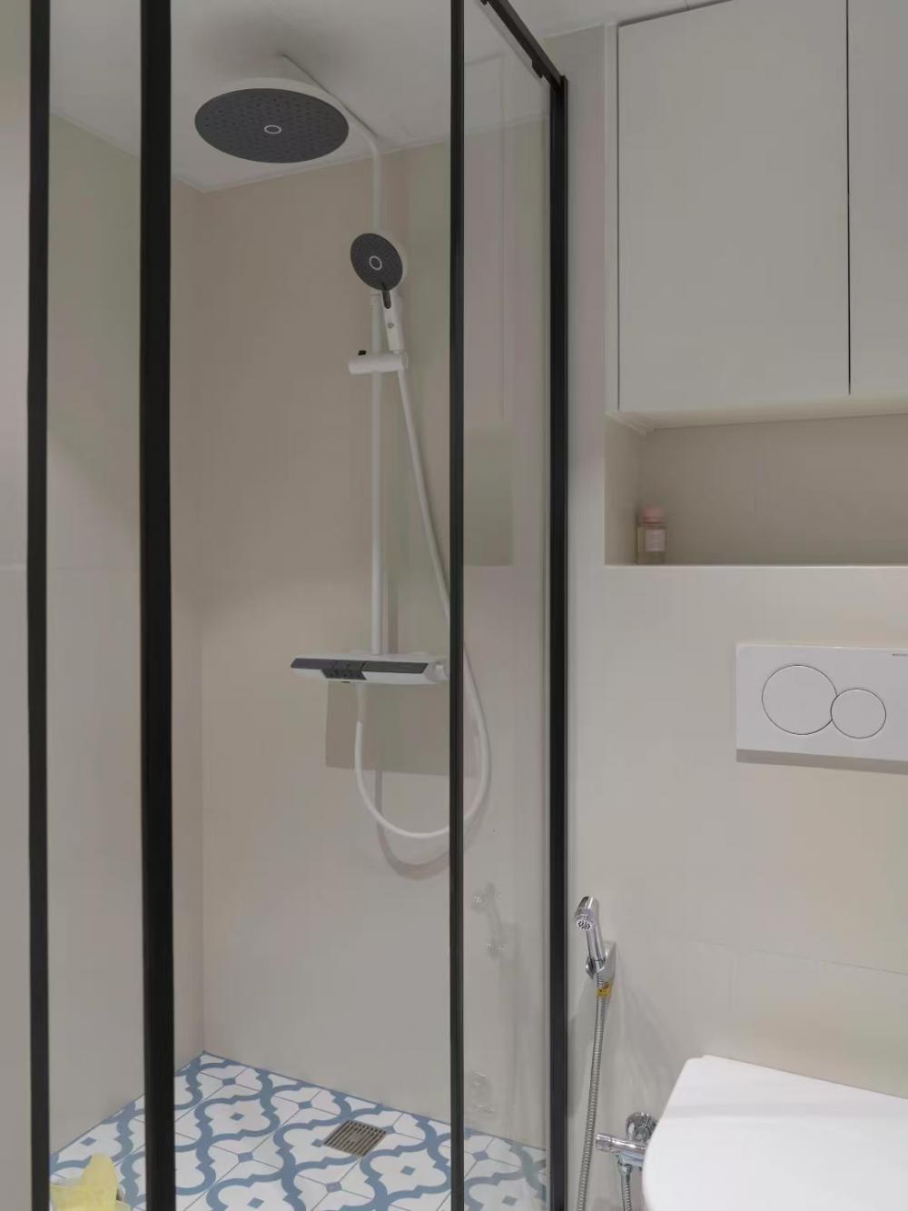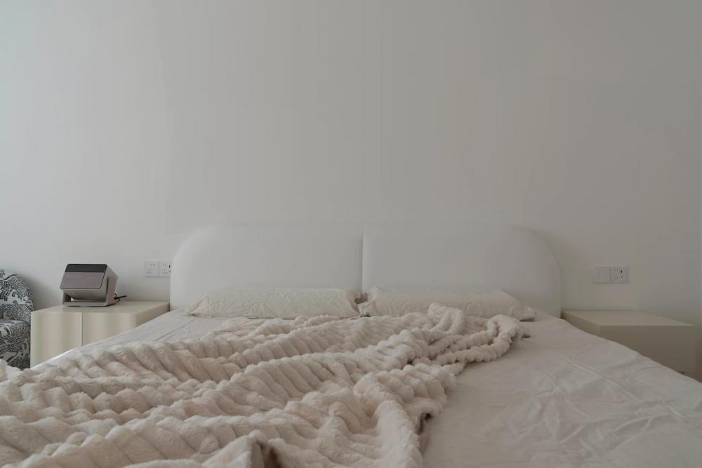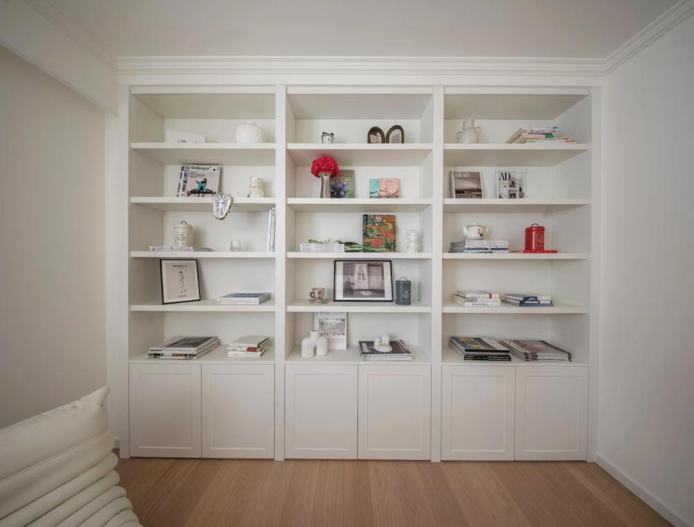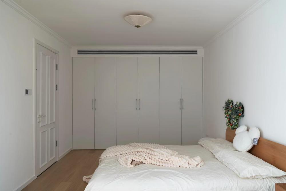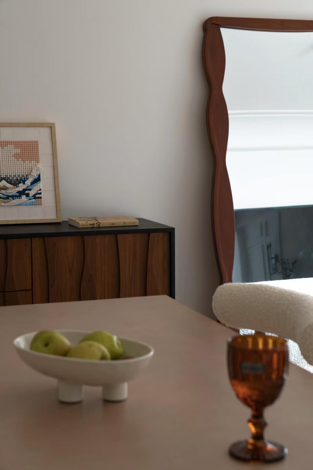 一进门就是走廊式收纳,以实用为主,新加了3.5米的长柜子,依次是透气的壁挂中柜,用来收纳通勤的鞋子以及外出杂物。 厨房中间是烹饪区,右边是烤箱等电器柜,洗切炒一气呵成,厨房的大小也足够2个人同时操作 右边的电器区墙上也预留了电力轨道,方便小家电的使用。整个橱柜都是纯白的,显得空间敞亮。 往里走是宽敞的餐客厅,慢慢的法式风扑面而来。 餐区很大,两侧都安排半柜的情况下,放1米8的大桌也很宽敞。 整体的设计,按照业主的生活需求来,一侧安排管线机和饮水用具。 柜和旁边的镜子都是比餐桌更深的樱桃木色,有层次,实用性足够,与整体的风格一致。 客厅与餐区一体,通过视线划分空间,曲线围合的沙发和区域划分让每个功能区虽处在一个空间,却有独立的视觉感受。 客厅左边是原来的阳台,扩充客厅空间感,简单陈列了复古柜子,增强尽端的仪式感。 客厅正中央的墙面则留给了壁炉,是所有视线的中心,绝对对称,非常貌美。 客厅右边则是电视柜,因为是围合的曲线沙发,搭配单人位,看电视也是正视角,不会有斜视的不适感。 主卧功能也很完善,除了储物空间,还有独立休息区和观影功能。 餐客厅另一侧的走廊通往书房和次卧,书房改成双开门,更通透明亮。 书房里做了整墙书柜、阅读区和两人使用的书桌。女业主平时很喜欢在这里休息看书。 次卧目前业主没怎么用,保留了基础功能,为以后的儿童房使用做准备。整面衣柜设计,左边两扇还藏了一个小仓库,收纳容量充沛。 主卫地面是粉白色的小花砖,墙面贴了粉色方砖,半墙拼色,粉粉糯糯。 客卫改变了入口方向,并拓宽了一部分餐厅面积作为洗衣区和盥洗区。洗手台延续了主卫配色,在洗手池局部贴了一圈粉色挡水条。