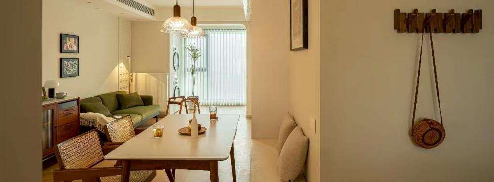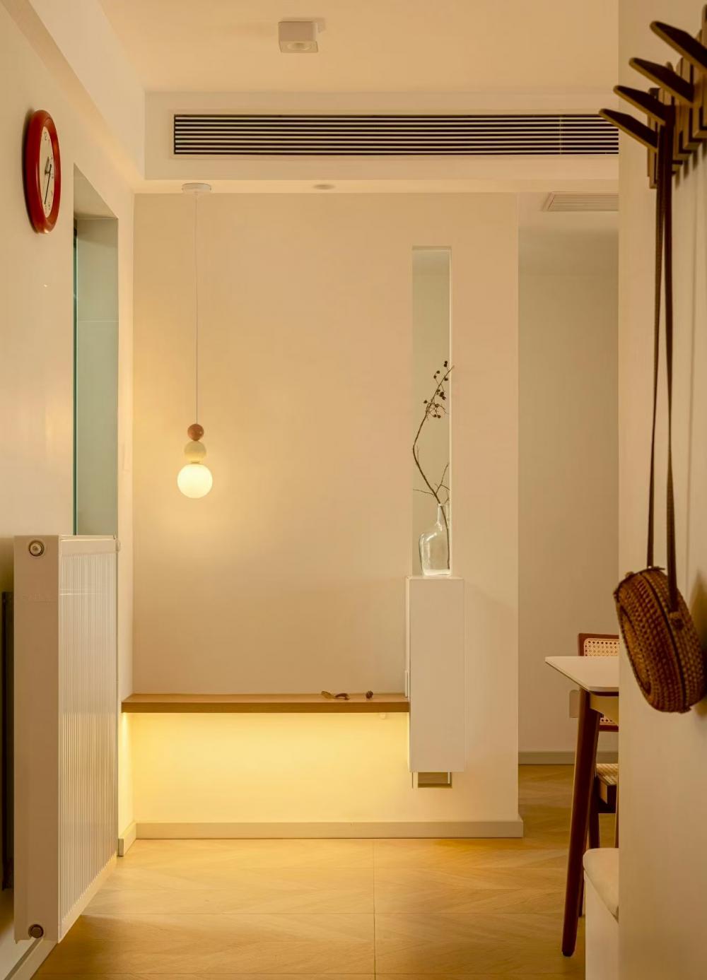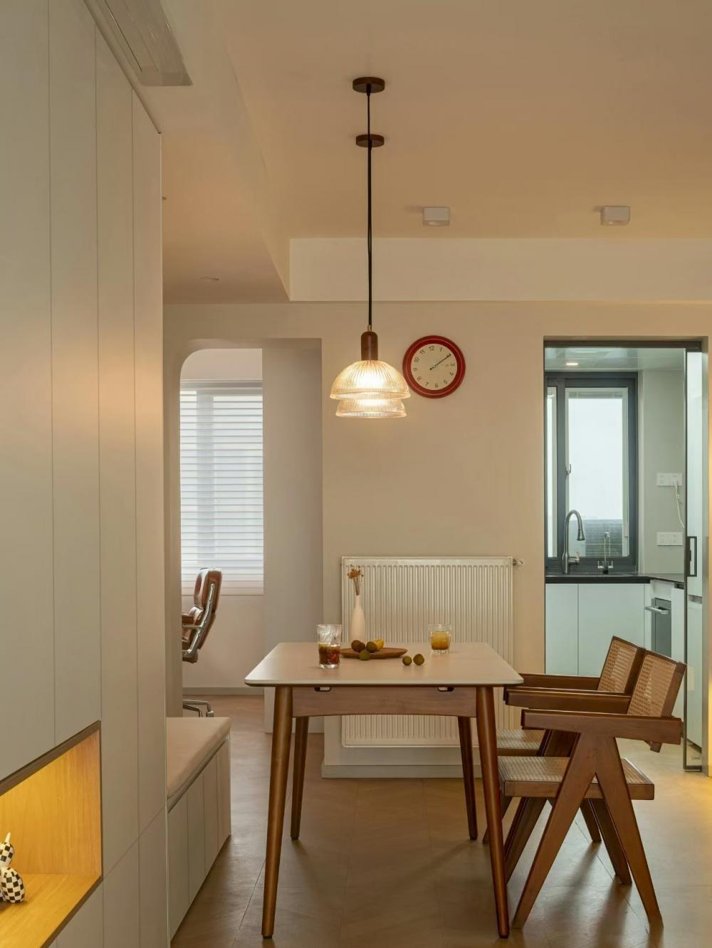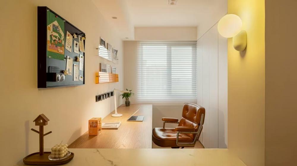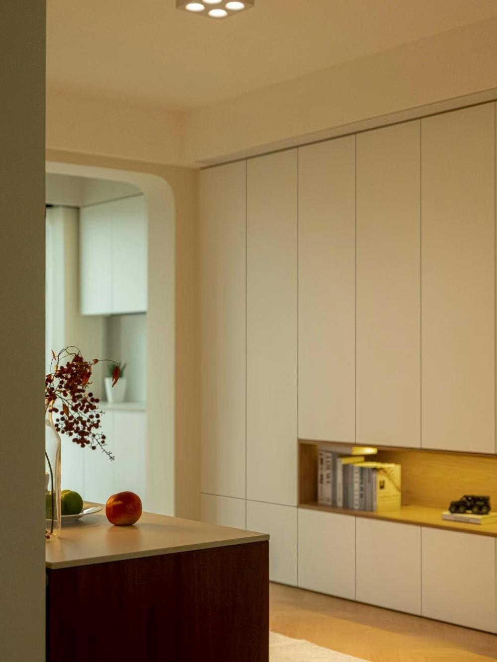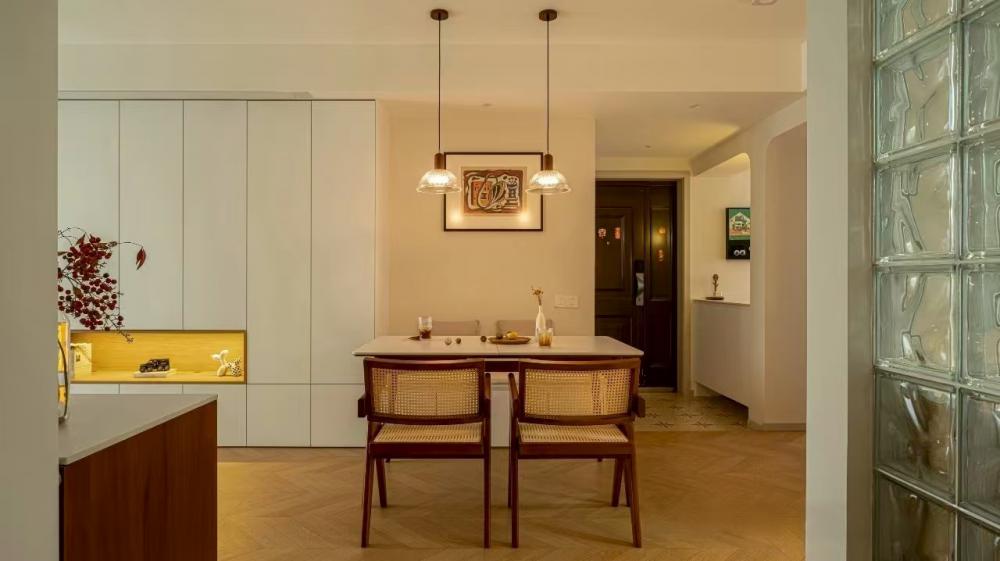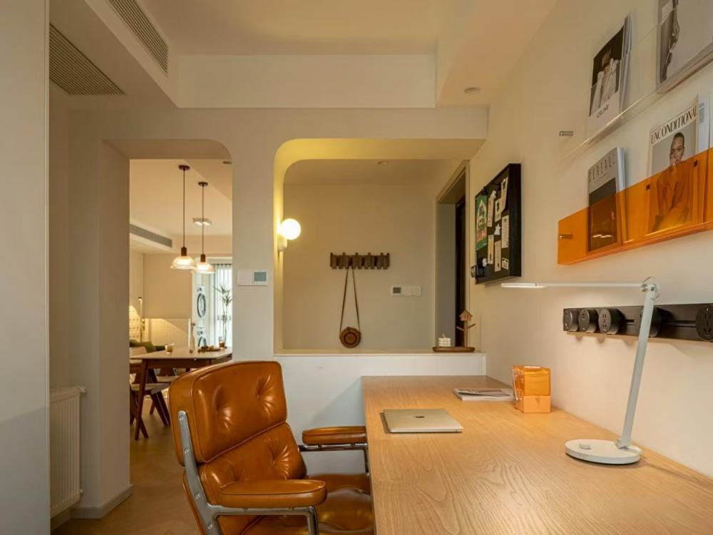 入户设置一处端景,原户型并无此面墙体,这样的设计避免了入户直视全屋,开门见景,又可以作为室内外过渡缓冲的空间。 客厅以柔润的香草色为基调,淡淡的暖调中透着清爽,带给人治愈与放松感,创造了一个令人愉悦的环境,一切看起来都很平衡。 沙发背景墙一侧加入方格造型的石膏肌理板,塑造了墙面的立体感,细腻的质感也让空间更显高级。 由整面的封闭式柜体打造出电视背景墙,视觉上更加“整齐划一”,中间镂空一处作为展示性收纳,满足多种收纳需求,内置灯带,增添了空间的层次感,给人一种灵活多变的空间效果。 门厅一侧的墙面安装了胡桃木色的琴键衣帽钩,提升立面空间的收纳利用,进门之后挂包包、钥匙之类的很方便,既美观又实用。 穿过门厅来到餐厅,干净清爽的色调给视觉感官带来顺滑的轻柔感,让安谧舒适的氛围萦绕于整屋之中。 餐桌+餐椅+卡座的组合方式,将美感与实用完美结合;胡桃木、岩板、藤编的材质相互中和,简约中透露出复古,清新又沉稳的配色为空间注入融融暖意。 由电视柜延伸定制卡座,让空间更加连贯统一,下方的地柜增添了餐厅的收纳,舒适与实用相结合。 U型厨房的设计,将部分的厨房家电嵌入至橱柜中,保障空间使用的流畅性与整洁。白色橱柜与黑色台面形成强烈对比,使空间看起来更有层次和深度,营造出简洁、时尚的厨房环境。 半开放式的书房,定制一款长书桌,原木的色调为室内空间增添一份自然、温馨的气息;搭配一把棕色的真皮办公椅,为居家办公和休闲营造出放松又惬意的栖息地。 半开放式的书房,定制一款长书桌,原木的色调为室内空间增添一份自然、温馨的气息;搭配一把棕色的真皮办公椅,为居家办公和休闲营造出放松又惬意的栖息地。 通过户型改造,在公区的走廊处设置独立洗手台,从而提高家庭的使用效率。利用玻璃砖作为墙体隔断,半透明的效果保证了私密,又不影响采光,避免了客餐厅直视的尴尬。 卧室,一种恬淡安宁的感觉铺面而来,使人感到放松和舒适。穿过拱形门洞,即可进入步入式衣帽间和主卫,通过户型改造让空间的功能划分更加合理和便捷。