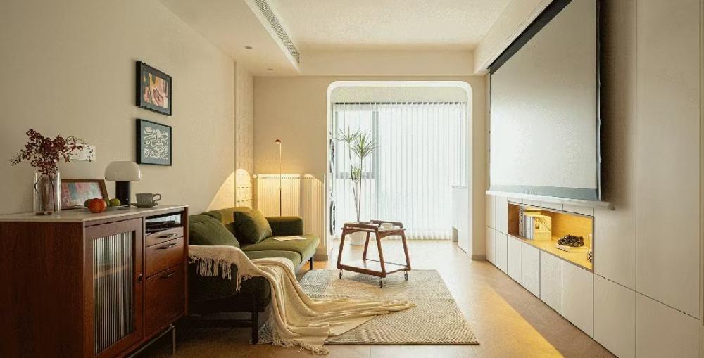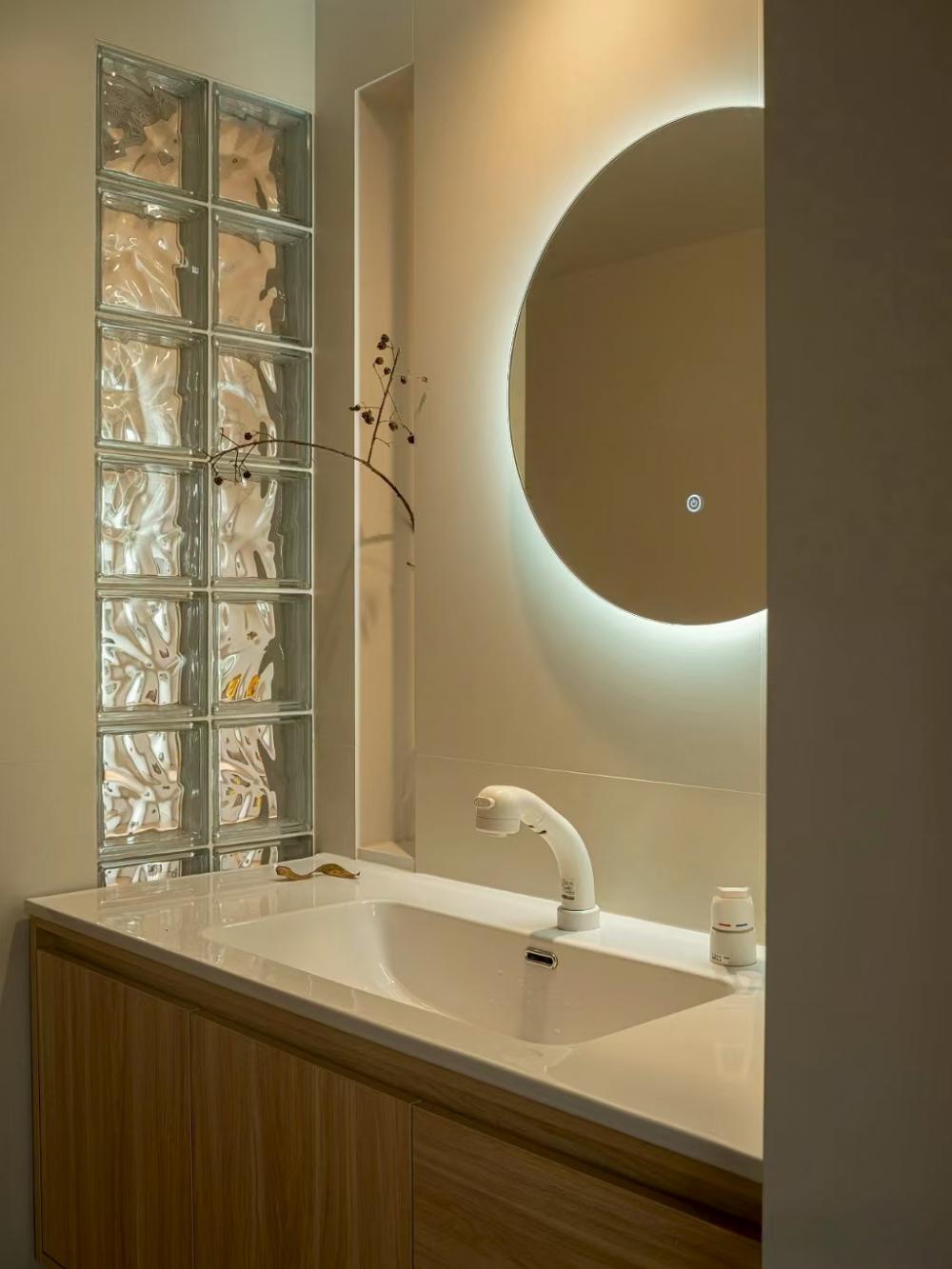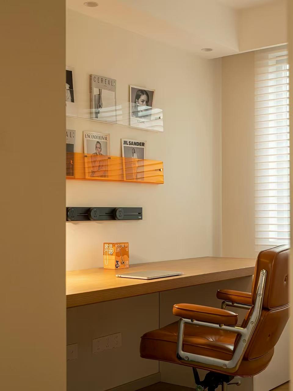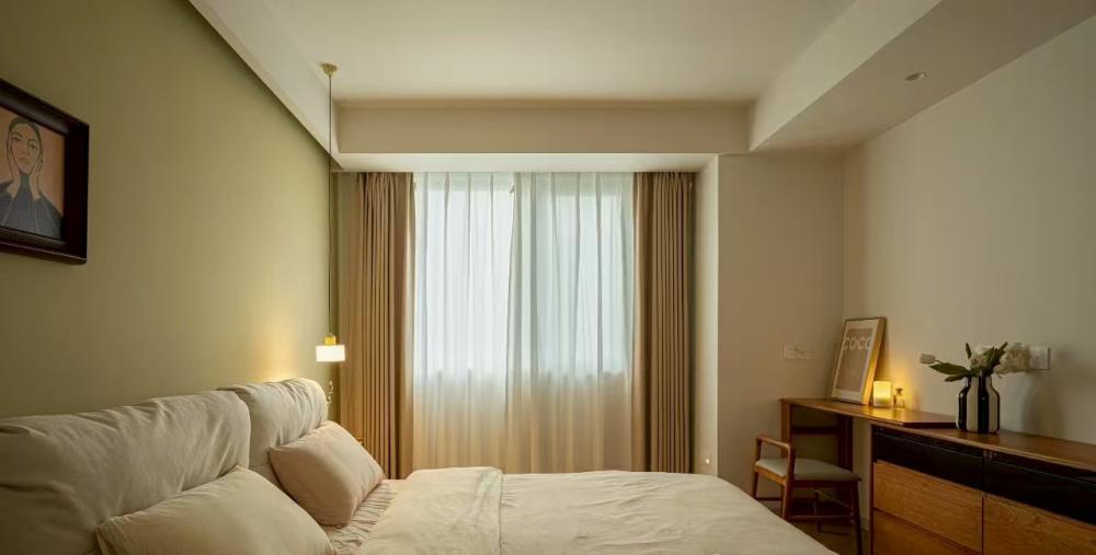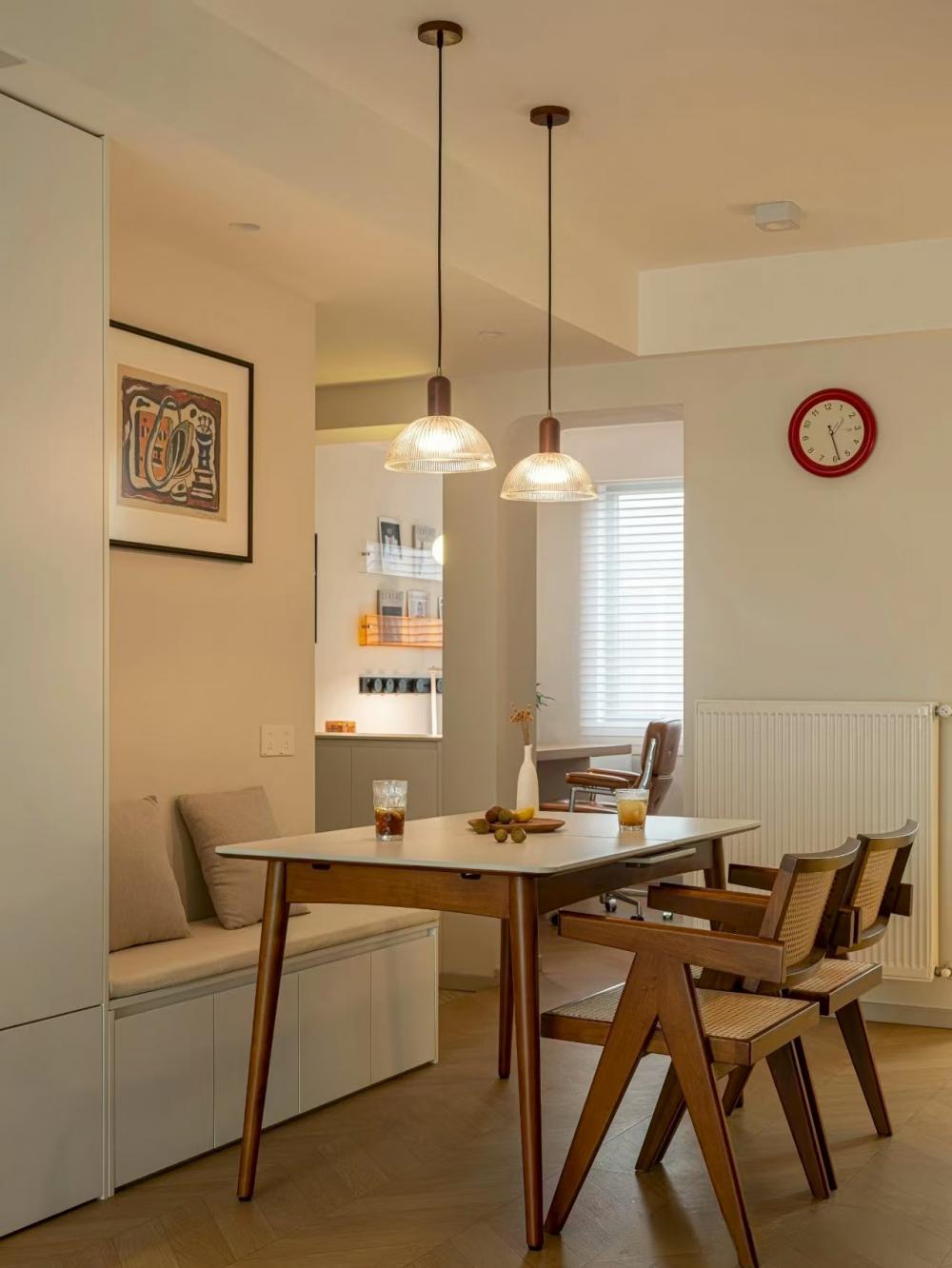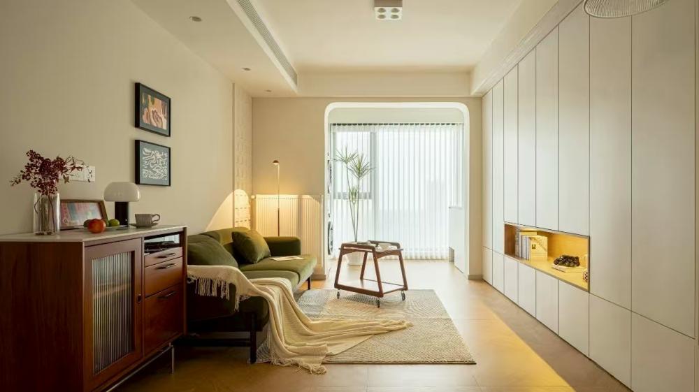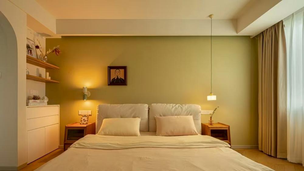 入户设置一处端景,原户型并无此面墙体,这样的设计避免了入户直视全屋,开门见景,又可以作为室内外过渡缓冲的空间。 客厅以柔润的香草色为基调,淡淡的暖调中透着清爽,带给人治愈与放松感,创造了一个令人愉悦的环境,一切看起来都很平衡。 沙发背景墙一侧加入方格造型的石膏肌理板,塑造了墙面的立体感,细腻的质感也让空间更显高级。 由整面的封闭式柜体打造出电视背景墙,视觉上更加“整齐划一”,中间镂空一处作为展示性收纳,满足多种收纳需求,内置灯带,增添了空间的层次感,给人一种灵活多变的空间效果。 门厅一侧的墙面安装了胡桃木色的琴键衣帽钩,提升立面空间的收纳利用,进门之后挂包包、钥匙之类的很方便,既美观又实用。 穿过门厅来到餐厅,干净清爽的色调给视觉感官带来顺滑的轻柔感,让安谧舒适的氛围萦绕于整屋之中。 餐桌+餐椅+卡座的组合方式,将美感与实用完美结合;胡桃木、岩板、藤编的材质相互中和,简约中透露出复古,清新又沉稳的配色为空间注入融融暖意。 由电视柜延伸定制卡座,让空间更加连贯统一,下方的地柜增添了餐厅的收纳,舒适与实用相结合。 U型厨房的设计,将部分的厨房家电嵌入至橱柜中,保障空间使用的流畅性与整洁。白色橱柜与黑色台面形成强烈对比,使空间看起来更有层次和深度,营造出简洁、时尚的厨房环境。 半开放式的书房,定制一款长书桌,原木的色调为室内空间增添一份自然、温馨的气息;搭配一把棕色的真皮办公椅,为居家办公和休闲营造出放松又惬意的栖息地。 半开放式的书房,定制一款长书桌,原木的色调为室内空间增添一份自然、温馨的气息;搭配一把棕色的真皮办公椅,为居家办公和休闲营造出放松又惬意的栖息地。 通过户型改造,在公区的走廊处设置独立洗手台,从而提高家庭的使用效率。利用玻璃砖作为墙体隔断,半透明的效果保证了私密,又不影响采光,避免了客餐厅直视的尴尬。 卧室,一种恬淡安宁的感觉铺面而来,使人感到放松和舒适。穿过拱形门洞,即可进入步入式衣帽间和主卫,通过户型改造让空间的功能划分更加合理和便捷。