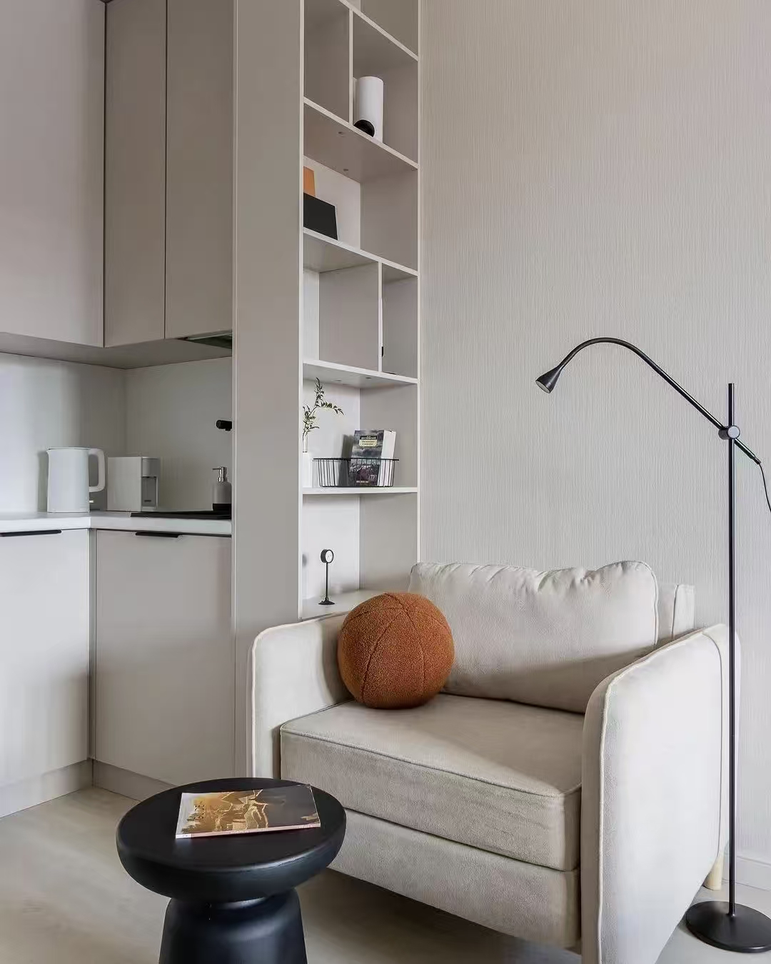 面积虽小,但有客餐厅、厨房、卫生间、阳台和独立的玄关,属于麻雀虽小五脏俱全的小公寓户型。 进门的独立玄关处,把全身镜贴在柜子上。柜子直接做到顶,充分的满足了玄关处的收纳需求。柜门打开里面做了精准收纳适配,将不同东西有了各自的收纳空间。 玄关进来后直接改造成用餐区,摆上黑色小圆桌 + 细腿餐椅,细腿设计也让视觉更轻盈,更不会那么占空间。 右侧就是开放式的厨房和沙发休闲区,厨房分为上层和下层柜子,中间作为操作台,将收纳利用到极致。 摆上一张小沙发和小茶几,这边便是小客厅了。侧面配上收纳柜,摆上书籍、装饰品等。可以满足日常放松、看书、刷手机等。 卧室区域,前方落地窗大阳台,让整个空间都很明亮。床头墙中间配上挂画,两边对称的装上壁灯,让空间表现的更有精致感。 在左侧角落塞下小书桌,满足临时办公、学习的需求。双开门的白色衣柜摆在这里,能满足衣物收纳需求,也不会显拥挤。 阳台太爱了,摆上懒人沙发,在这个冬天,可以暖洋洋的喝茶看书,看外面的风景。 卫生间空间紧凑,把洗手台设计的小一点,腾出的区域刚好收纳洗衣机,淋浴房做干湿分离