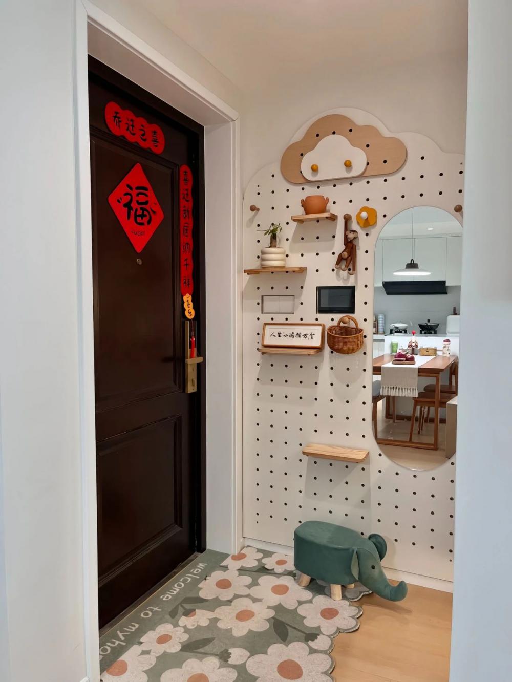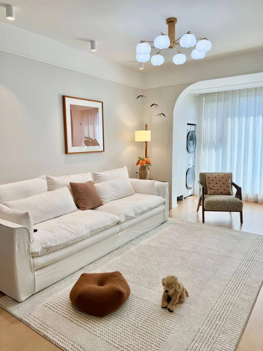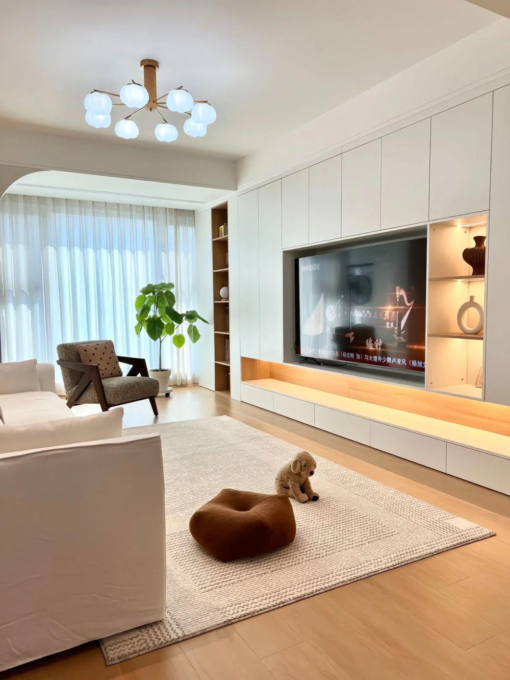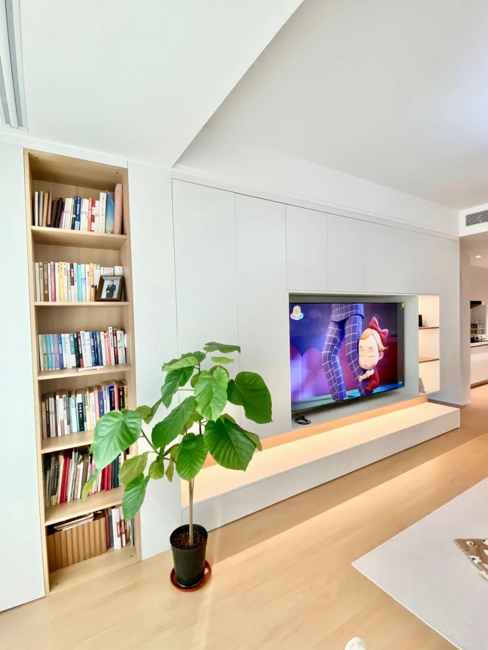 ▶这个小家建筑面积126平,套内97平,三室两厅两卫。 ▶客厅开间3.55米,沙发宽1米,75寸电视配上伸缩支架做到与柜门齐平。 ▶全屋通铺20x120cm 奶油橡木色木纹砖,哑光微肌理,非常有木地板的质感,369错缝贴,无过门石;全屋通刷杏子灰,灰调中带点绿色很高级,很适合原木风。 ▶做了5米满墙电视柜,美观又实用,杂七杂八的东西往柜子里一塞,没有随处可见的杂物,真的很省心;柜子深度40cm,柜门是哑光暖白双饰面板,无拉手设计,反弹器按压开门,层板是活动的,可以根据不同物品调节高度。电视柜留开放格,不然会显得压抑。 ▶阳台,窗户都没有做门套,刷乳胶漆收边,简约还好看;在阳台位置留出来一排书柜,躺在摇椅上看书很惬意。 ▶全屋柜子以暖白色为主,做见光板封板,只露出部分原木色,原木色太多的话容易装成出租屋;全屋家具以樱桃木为主,偏红调,很有质感不显廉价。 ▶走廊尽头的玄关用几个木板打造了一个木墩,既能储物,也能放个花瓶,插几支山归来,妥妥的氛围感拉满。 ▶半墙的干湿分离卫生间,既满足了实用性,又让小家平平无奇的走廊变得不再单调。半墙贴了瓷砖,洗手间是用水比较多的地方,贴瓷砖就更好打理一些,不怕溅水。下水管道做成墙排,好打理,下边还能拿来放盆或小凳子。在改水电的时候就留出线,安装智能镜柜。卫生间的门做单包套,简洁美观还省钱。 ▶11平小卧室,太好睡了。 没有复杂的装修,简单做了一圈双眼皮吊顶,墙面通刷杏子灰乳胶漆,顶部留的白色,通铺的369步步高木纹砖,奶茶色的窗帘。夕阳西下,影子映射到房间里,一切都是刚刚好的感觉!忙碌一天回到这样的小房间,睡上一觉,真是无比放松、惬意! ▶入户定制了洞洞板。