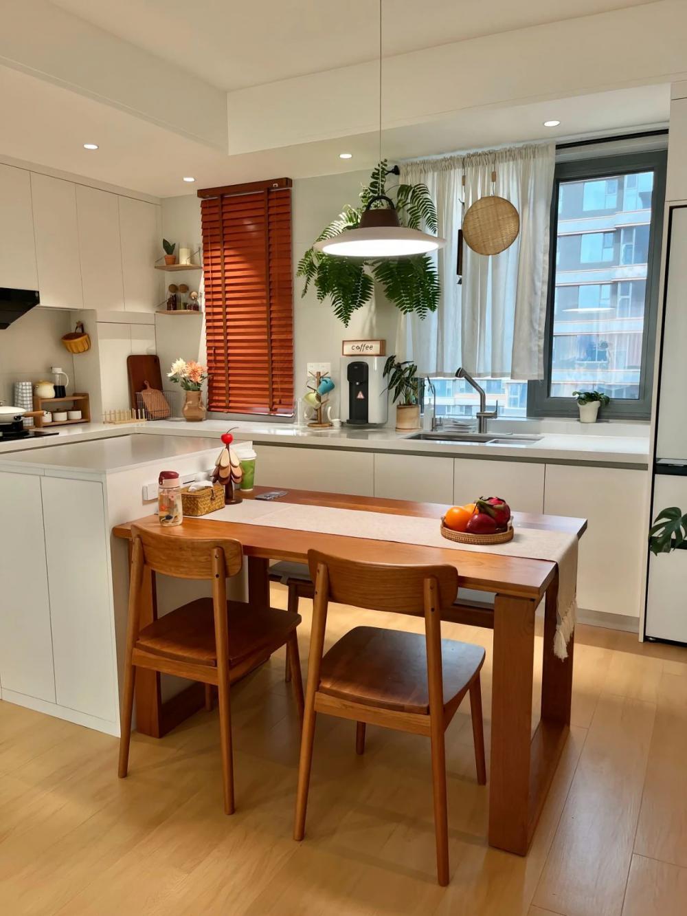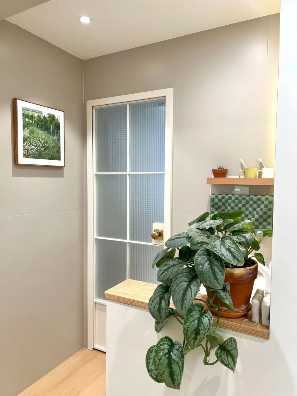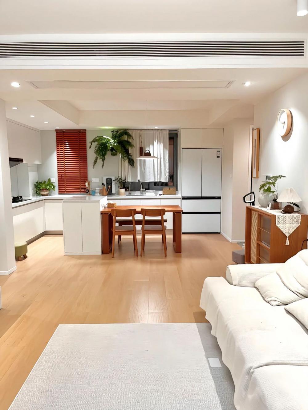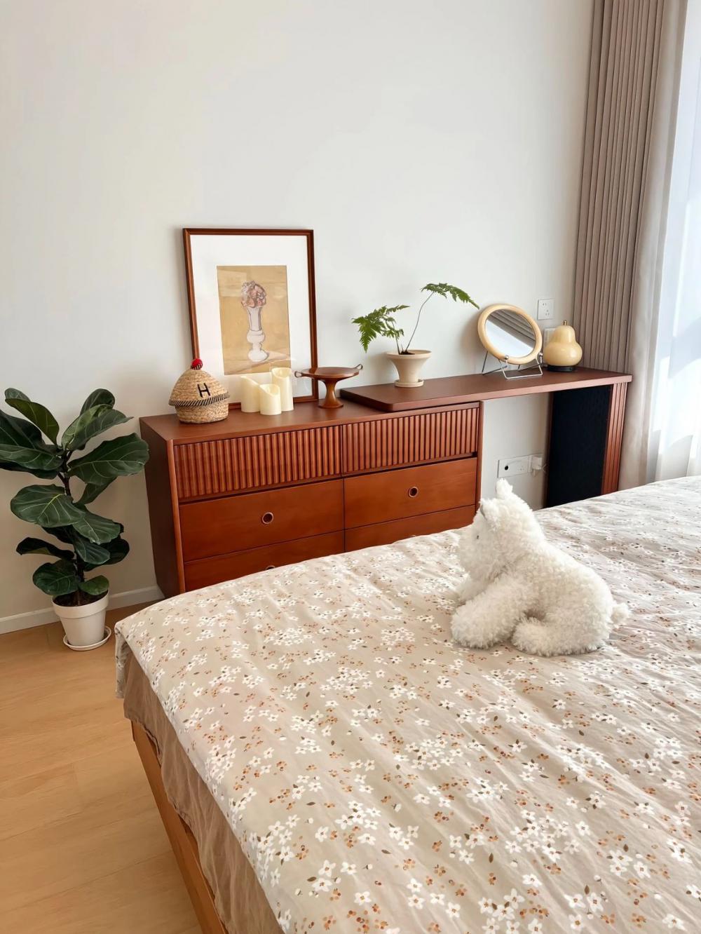 ▶这个小家建筑面积126平,套内97平,三室两厅两卫。 ▶客厅开间3.55米,沙发宽1米,75寸电视配上伸缩支架做到与柜门齐平。 ▶全屋通铺20x120cm 奶油橡木色木纹砖,哑光微肌理,非常有木地板的质感,369错缝贴,无过门石;全屋通刷杏子灰,灰调中带点绿色很高级,很适合原木风。 ▶做了5米满墙电视柜,美观又实用,杂七杂八的东西往柜子里一塞,没有随处可见的杂物,真的很省心;柜子深度40cm,柜门是哑光暖白双饰面板,无拉手设计,反弹器按压开门,层板是活动的,可以根据不同物品调节高度。电视柜留开放格,不然会显得压抑。 ▶阳台,窗户都没有做门套,刷乳胶漆收边,简约还好看;在阳台位置留出来一排书柜,躺在摇椅上看书很惬意。 ▶全屋柜子以暖白色为主,做见光板封板,只露出部分原木色,原木色太多的话容易装成出租屋;全屋家具以樱桃木为主,偏红调,很有质感不显廉价。 ▶走廊尽头的玄关用几个木板打造了一个木墩,既能储物,也能放个花瓶,插几支山归来,妥妥的氛围感拉满。 ▶半墙的干湿分离卫生间,既满足了实用性,又让小家平平无奇的走廊变得不再单调。半墙贴了瓷砖,洗手间是用水比较多的地方,贴瓷砖就更好打理一些,不怕溅水。下水管道做成墙排,好打理,下边还能拿来放盆或小凳子。在改水电的时候就留出线,安装智能镜柜。卫生间的门做单包套,简洁美观还省钱。 ▶11平小卧室,太好睡了。 没有复杂的装修,简单做了一圈双眼皮吊顶,墙面通刷杏子灰乳胶漆,顶部留的白色,通铺的369步步高木纹砖,奶茶色的窗帘。夕阳西下,影子映射到房间里,一切都是刚刚好的感觉!忙碌一天回到这样的小房间,睡上一觉,真是无比放松、惬意! ▶入户定制了洞洞板。