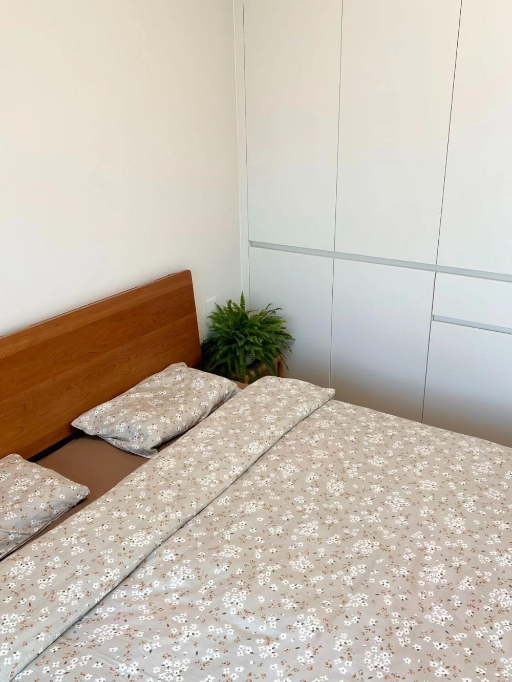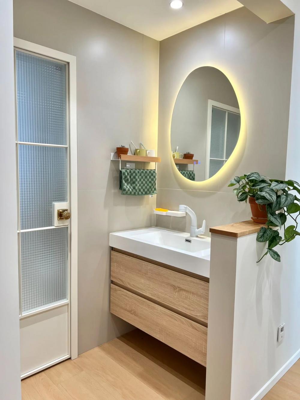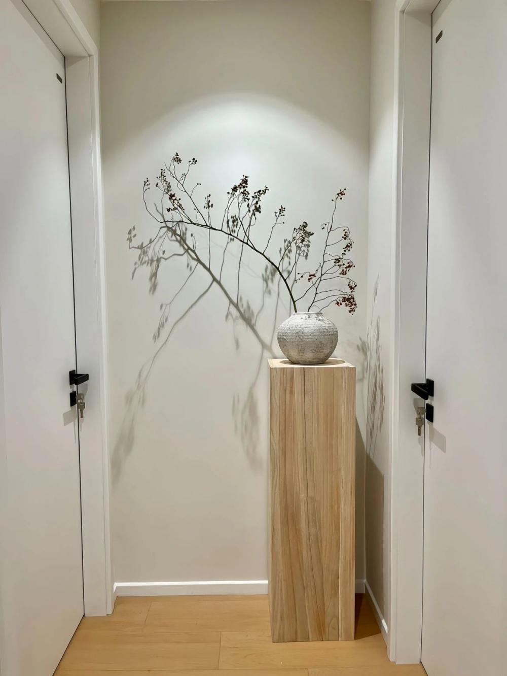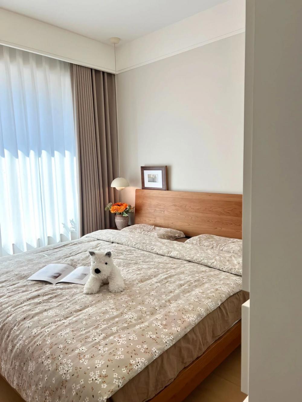▶这个小家建筑面积126平,套内97平,三室两厅两卫。 ▶客厅开间3.55米,沙发宽1米,75寸电视配上伸缩支架做到与柜门齐平。 ▶全屋通铺20x120cm 奶油橡木色木纹砖,哑光微肌理,非常有木地板的质感,369错缝贴,无过门石;全屋通刷杏子灰,灰调中带点绿色很高级,很适合原木风。 ▶做了5米满墙电视柜,美观又实用,杂七杂八的东西往柜子里一塞,没有随处可见的杂物,真的很省心;柜子深度40cm,柜门是哑光暖白双饰面板,无拉手设计,反弹器按压开门,层板是活动的,可以根据不同物品调节高度。电视柜留开放格,不然会显得压抑。 ▶阳台,窗户都没有做门套,刷乳胶漆收边,简约还好看;在阳台位置留出来一排书柜,躺在摇椅上看书很惬意。 ▶全屋柜子以暖白色为主,做见光板封板,只露出部分原木色,原木色太多的话容易装成出租屋;全屋家具以樱桃木为主,偏红调,很有质感不显廉价。 ▶走廊尽头的玄关用几个木板打造了一个木墩,既能储物,也能放个花瓶,插几支山归来,妥妥的氛围感拉满。 ▶半墙的干湿分离卫生间,既满足了实用性,又让小家平平无奇的走廊变得不再单调。半墙贴了瓷砖,洗手间是用水比较多的地方,贴瓷砖就更好打理一些,不怕溅水。下水管道做成墙排,好打理,下边还能拿来放盆或小凳子。在改水电的时候就留出线,安装智能镜柜。卫生间的门做单包套,简洁美观还省钱。 ▶11平小卧室,太好睡了。 没有复杂的装修,简单做了一圈双眼皮吊顶,墙面通刷杏子灰乳胶漆,顶部留的白色,通铺的369步步高木纹砖,奶茶色的窗帘。夕阳西下,影子映射到房间里,一切都是刚刚好的感觉!忙碌一天回到这样的小房间,睡上一觉,真是无比放松、惬意! ▶入户定制了洞洞板。