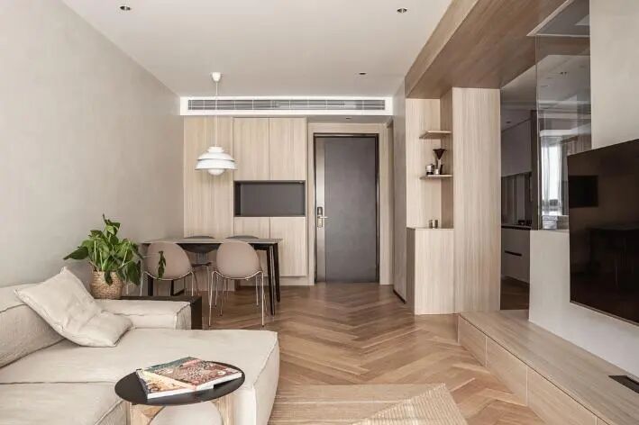 现代简约风和侘寂风的结合,给人恬淡安静的舒适感,也让家更显轻盈优雅,效果堪比大平层。 改造前户型分析: 1、入户进门缺少储物空间,回家后置物不方便; 2、厨房空间比较紧凑,不能满足屋主对烹饪的需求; 3、三居室格局,但空间划分比较凌乱,功能不明显; 4、卫生间干湿一体,空间利用率不高。 根据户型问题和实际居住需求,做以下改造: 1、进门拆除墙体增加鞋柜设计,局部镂空设计,实现置物平台需求; 2、局部拆除厨房隔墙,利用承重墙和过道,实现回形动线,改善居家动线; 3、与书房相邻卧室,改造成步入式衣帽间,满足屋主对衣物的收纳需求; 4、与客厅相邻的卧室改造成书房,转角利用玻璃替代砖墙,增加通透性; 5、卫生间重新调整布局,不仅提高了空间利用率,实用性也得到改善。