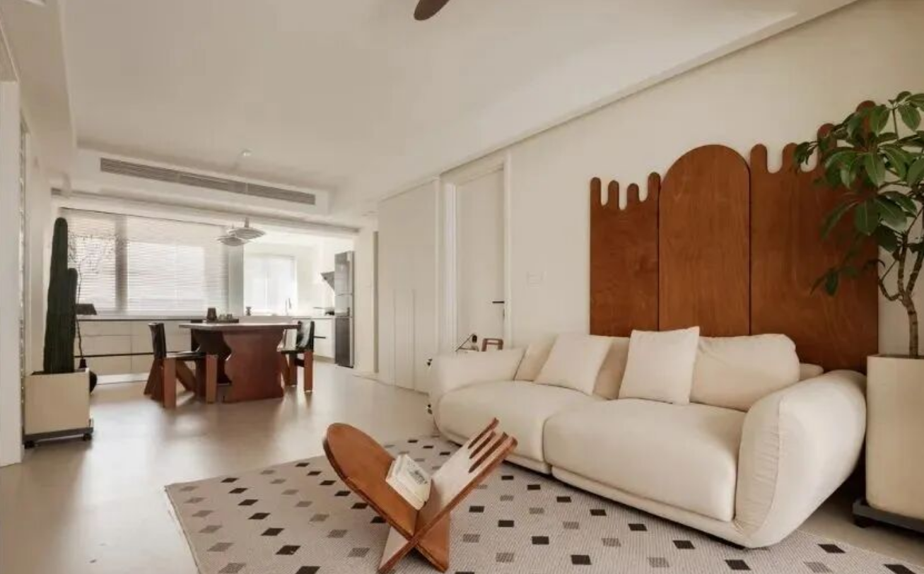 今天分享的案例是面积为100㎡的三居室,柔和甜美的奶油风搭配复古文艺的中古风,打造一个温馨浪漫且有质感的居家空间。 原户型格局存在很多弊端,比如,入户无玄关,收纳不足容易造成区域凌乱;客厅空间偏小,采光不足;厨房空间狭小,可操作空间有限,不利于厨房电器的布置。 改造后的空间布局,在入户门左侧定制玄关柜,增加储物功能;将客厅与阳台打通,改善室内采光扩大空间视觉感;厨房拆除隔断墙,半开放式厨房更通透;除此之外,卫生间做了干湿分离设计,提升使用效率。 客厅以低饱和度的奶油色调为主,搭配浅色的地砖,提升了整体空间质感,给人温润舒适的感觉。原有的客厅面积相对较小,因此将阳台纳入客厅,改善采光又扩大空间视觉感。弧形垭口门洞设计,为空间增添一抹柔和温婉。 电视背景墙定制整排柜体,增加储物空间,柜门采取一门到顶的设计,使其平整又统一。上方隐藏了投影幕布,收纳柜和投影仪背景的结合,颜值和实用性都满分。 沙发背景以胡桃木折叠屏风饰墙,颇具中古范,加上绿植和软装的完美结合,为客厅增添了几分雅致美感。 拆除餐厨空间隔断,合理利用餐厨区靠窗的空间,巧妙嵌入洗碗机和蒸烤箱等电器,节约空间,同时也提升了生活的幸福感。 餐厅选择了胡桃木色的家具,复古的造型与清晰的肌理感,营造出中古的质感与腔调,与奶油色系混搭,既细腻也更有格调。 卫生间做了干湿分离设计,洗漱区和沐浴区可同时使用,提升日常使用效率。浴室柜悬挂式设计,方便清洁地面减少卫生死角。 卫浴空间均做了壁龛,可放置卫浴用品,替代置物架,满足收纳与美观的需求。 主卧延续家中整体色调,增加空间的整体性和互动性。中古风的穿衣镜,胡桃木元素与波浪镜面的组合,设计感爆棚,使空间更具灵动性。 次卧空间不大,简单的布置,满足基本起居。 客房采用多功能地台床设计,兼顾睡眠与休闲需求,搭配大幅装饰画,增添艺术氛围。