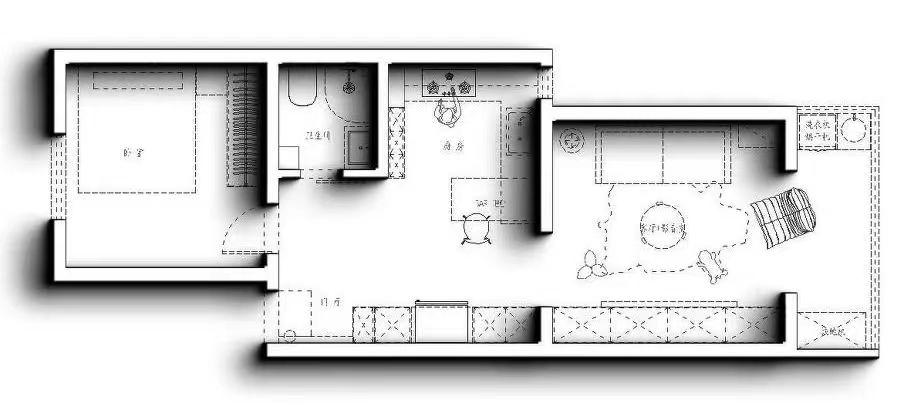 原本是两居室的格局,因为两口子住只需要一个房间就可以,就将其中一个带阳台的卧室改造成了客厅,提升居住空间的宽松与舒适性。 原始隔墙户型图,只有墙体分割出的轮廓,没有功能区划分。右侧的长条形空间采光和通风容易出现死角,整体空间利用率低。 经过生化过的布局图,将原本分散的小空间整合为开阔的公共区域,客餐厅相连,视觉上更显通透,也提升了空间利用率。