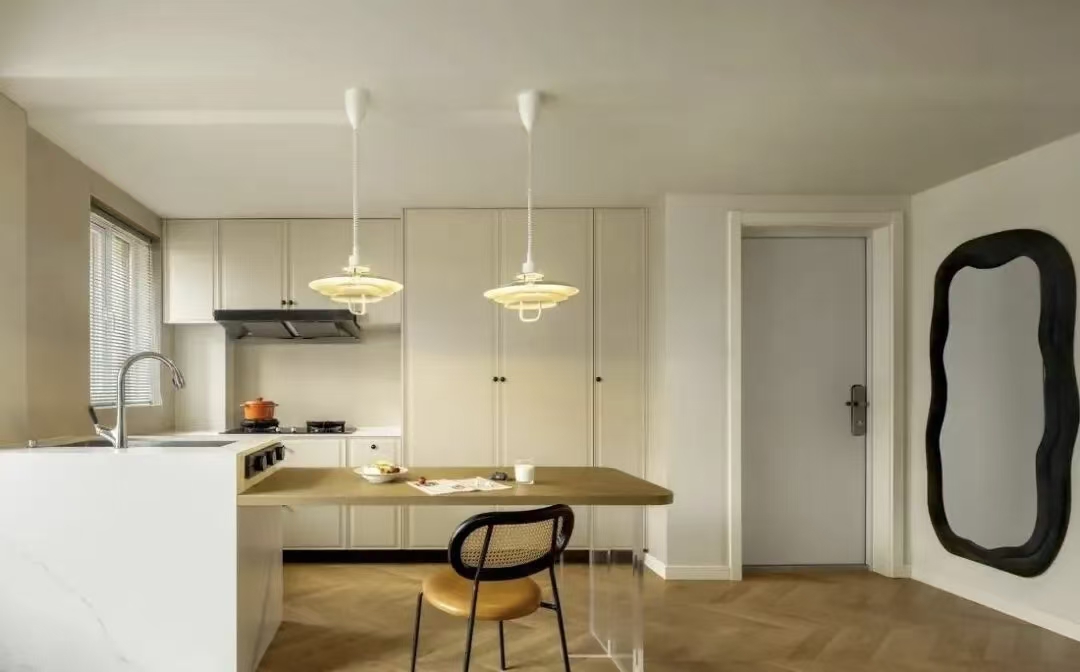 改造后的户型从入户到客厅、餐厨及卧室,动线规划清晰合理,避免了空间交叉和干扰。次卧调整了入门位置,为客厅引入更佳采光。厨房与餐厅采用一体化设计,使烹饪与用餐体验更显流畅。 入户后右侧即为开放式的餐厨区。门旁墙面镶嵌的镜子成为视觉焦点,其不规则的轮廓呈现出自然流动、略带起伏的曲线,打破空间的规整感,营造出松弛而又前卫的艺术氛围。 电视墙以简洁的石膏线条勾勒出矩形框格,既保留了法式的优雅韵味,又避免了厚重感。 客厅区域放置复古绿色沙发与玻璃茶几,中间一张木质长桌便作为餐厅使用,亦兼具吧台隔断功能。 厨房设计以上下柜体充分满足收纳需求。中部烹饪区可轻松料理家常小菜,柜门上黑色小圆钮设计,既让开合更为顺手,亦成为醒目的点缀。 沙发侧面的墙面设有一扇隐形门,内通小次卧。 卫生间洗手台改为外置,空间更显宽敞,实用性及便利性得到提升。 卫生间洗手台配置圆形镜面,中部岩板台面与嵌入式台盆,下方设悬空的收纳抽屉。墙面铺贴复古绿色小砖,整体层次分明,观感清新悦目。 主卧室以宽大的双人床为中心,床头两侧分别设置壁灯与床头柜,兼顾睡前阅读与日常置物的功能需求。 阳台的另一侧定制了顶天立地米白色储物柜,充分拓展收纳空间。阳台一侧配置洗衣机,形成便捷的洗衣功能区。 次卧空间虽不大,但采光充足,功能完备。床铺临窗布置,另一侧为书桌与书柜一体化设计,充分满足收纳与办公需求。