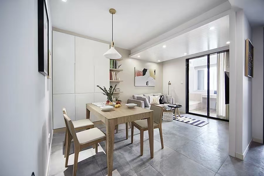 入户与客厅中间增设隔断,重新划分客餐厅空间,隔出一间小房间。看似简单的改动,却让原本的两房变成三房,满足日常生活需求。 客厅采用无主灯设计,分区散点设计让照明更均匀更全面。米色的沙发墙,丰富了墙面色彩,看上去也很温馨。 隔断墙又是电视墙,直接刷白简洁干练。放弃电视柜释放客厅空间,电视左侧设计了置物架,可以收纳生活小物件 卫生间简洁自然实用,除了浴室柜之外,还定制了储物柜增加收纳 L型厨房,一边是灰色的墙砖,一边是温暖的原木橱柜,一冷一暖搭配恰到好处,干净利落、整洁有序。 主卧,色彩搭配上非常的柔和,营造出舒适自然的睡眠环境。同样的采用无主灯设计,空间自由度高。 儿童房空间不大,装修简洁清新。彩色几何软靠搭配卡通床品,色彩丰富让儿童房酷炫十足。书桌取代了床头柜,显然更实用,让孩子拥有独立完整的空间。 隔出的小房间,设计成多功能房,日常可办公学习、长辈来了又可以当客房。定制家具提升空间利用率,榻榻米床搭配书桌和衣柜,让小空间多出许多收纳。