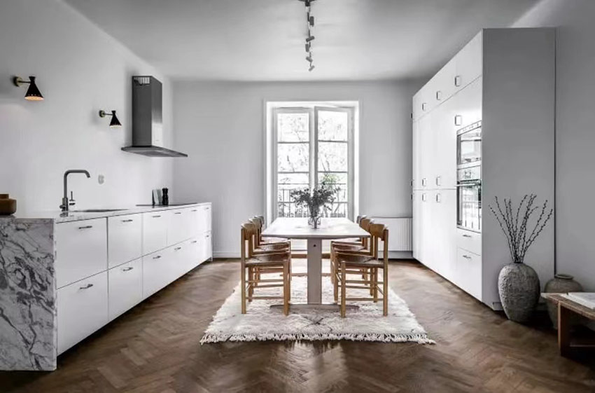 公寓的天花板直接“裸露”出来,没有采用吊顶,令层高更显突出。白色+原木色的主调设计,大气天然。