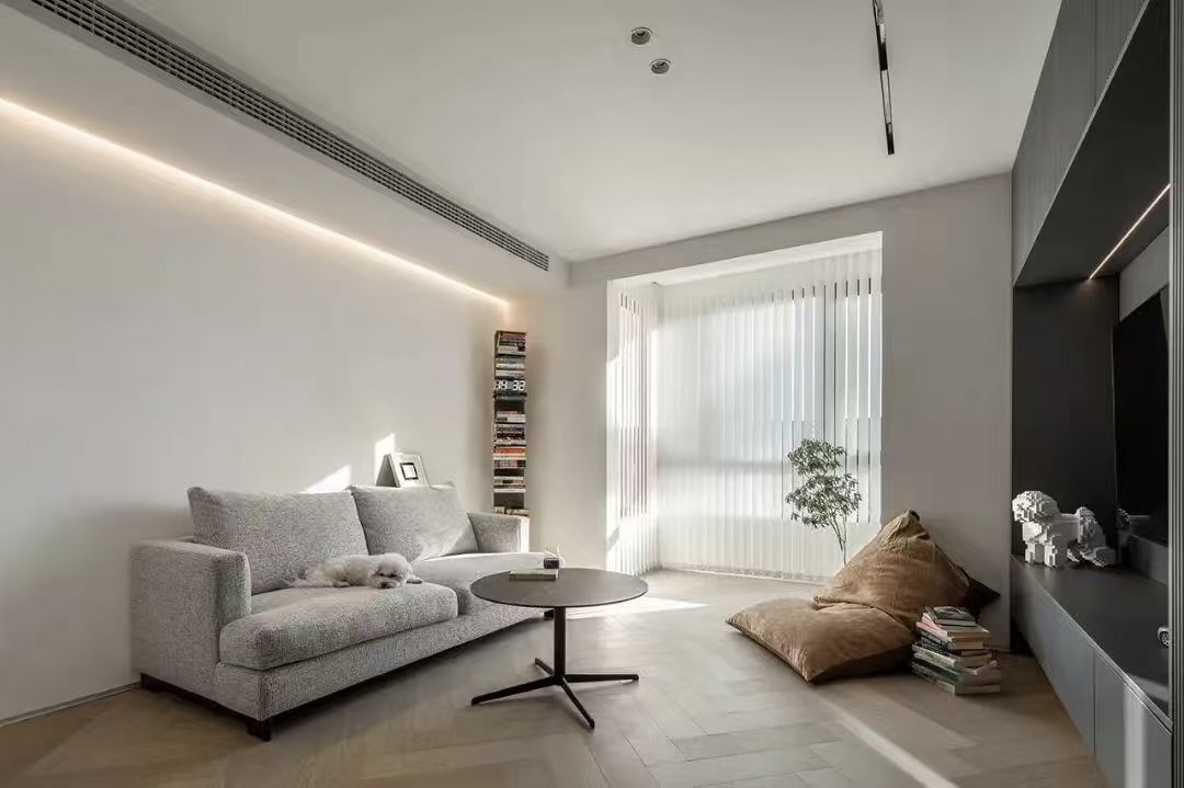入户门的地方设计了一个玻璃砖的屏风,两侧都设计了收纳柜,满足玄关全方位的收纳需求。 开放式厨房内定制了U型橱柜,餐桌紧挨着放置,以灰色为主,灰色水磨石纹理的地砖、墙面是灰色系岩板再搭配高级灰的橱柜,干净利落。整个餐厨区面积不大但看上去很上档次很高级。 改造后的客厅,借用了部分主卧空间在电视墙定制了一组收纳柜,解决客厅的杂物收纳。 主卧设计了隐形门,材质与电视柜同款,颜色与餐边柜一致。没有设计收纳空间,只是在墙角处放置了一个置物架,小梯子的样式,很有创意,在里面开了一扇双开门,推开门是卫生间和衣帽间。 衣帽间和卫生间内延续了公区的设计风格,清冷的灰色调;卫生间是三分离式设计,超大的洗漱区还能兼顾化妆护肤,淋浴区也很宽敞,还有独立的马桶间,动线非常合理。 瑜伽室和洗漱区、公区连接,运动的时候可以随时到厨房喝水、运动结束直接在洗漱区打理,非常方便。