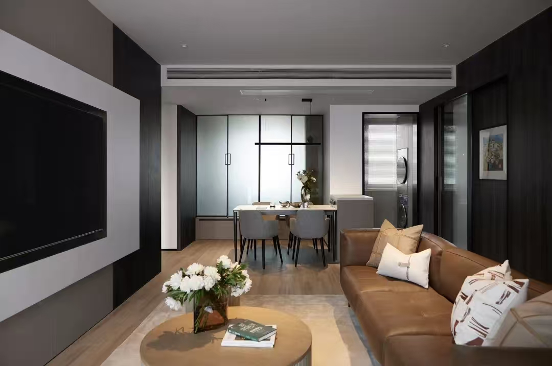 这是一套面积为85平米的小家,屋主希望新家是独有的品质感且温馨舒适、简洁大气的,设计师对空间动线进行了细致梳理与优化,最终打造出收纳充裕、布局合理的三室两厅两卫 客餐厅一体的格局,开阔通透,极具纵深感,给人带来视觉上的放松。 深色木质墙面,为空间奠定了沉稳克制、自然温润的基调。棕色皮艺沙发散发出独特的粗犷与沧桑之感,坐感舒适之余,颇具质感。理性硬朗的直线和温婉灵动的曲线,共同发挥着各自的独有优势,将空间勾勒刻画得更加生动、张力十足。 餐厅与客厅相连通,便于平日家人之间的交流与沟通。设置小岛台,除了备餐以外,还可以用作休闲水吧台或者临时办公场所。 改变了原有厨房的入口,将其面积予以拓宽,形成了“U”字型厨房,利用率得到大大提升。 卧室以冷色调为主,营造出宁谧的休憩氛围, 按居住需求打造出一个多功能榻榻米空间,平日里用来进行阅读、喝茶等休闲活动,也可变身客房。 主卫拥有良好的采光通风,选用沉稳的灰色调,内敛克制。公卫同样延续灰色调,通过深浅不一营造层次感,打造出宁静的氛围。