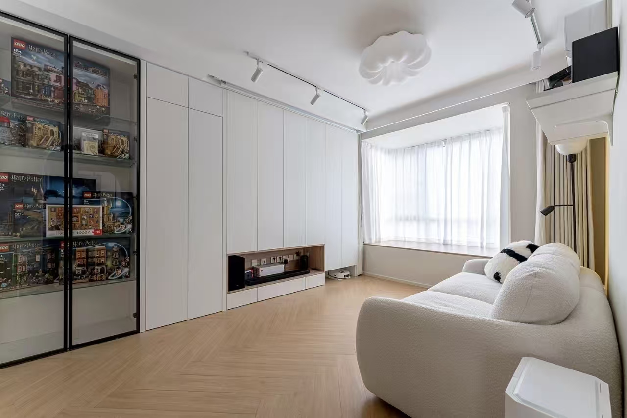 这是面积70㎡的新房,业主两个人都是早九晚五的工作性质,偶尔也会在家里加加班。所以在家里单独做了个书房。另外色彩上喜欢比较明快的色调,让空间的氛围感更显活泼。 原始隔墙户型图,空间虽然很充足,但是没有很好的规划出每个区域的位置。大格局没什么变,利用空间增设了不少收纳,门厅前面做成弧形卡座,将其中一间卧室改造成书房。 入户进门玄关处,图中左侧布置白色玄关柜搭配鱼骨拼木地板,视觉自然敞亮,下方留出15CM高度收纳室内拖鞋。落尘区铺上黑白格地毯,右边靠墙配一面全身镜,满足进出门可以整理妆容。 进来就是餐厅,白色玄关柜也起到餐边柜的作用,中间凹槽可以收纳装饰品,还有饮水壶等,上方封闭式柜子可以收纳大件物品,满足收纳需求。餐厅的转角卡座是一体化定制,这边做的恰到好处. 客厅取消茶几桌,以奶油白搭配鱼骨拼木地板,让空间清爽又温馨。把一整面墙打造成柜子,增加收纳。 客厅望去餐厅方向,天花板无主大灯,简约的白色墙面搭配人字拼木地板,增加空间的延展性,更显大。 厨房进门左侧位置,刚好可以收纳一台双门冰箱,避免空间浪费,边上就是烹饪区,使用起来更加顺手。 进入主卧室,转角设计成纳区。飘窗的设计使得空间更休闲,坐在飘窗上晒太阳。 房兼衣帽间,右边玻璃已满是进门处,蜂窝帘遮挡的是收纳柜,以后方便再改造成卧室。横跨整面墙的大书桌,轻松满足双人的办公需求。 弧形门框进来,是卫生间外置的洗手台。一旁叠放洗烘机器,轻松解决大件电器摆放的突兀的问题。淋浴区保持墨绿色墙砖,独特的纹理让空间更显立体,用浴帘做干湿分离。