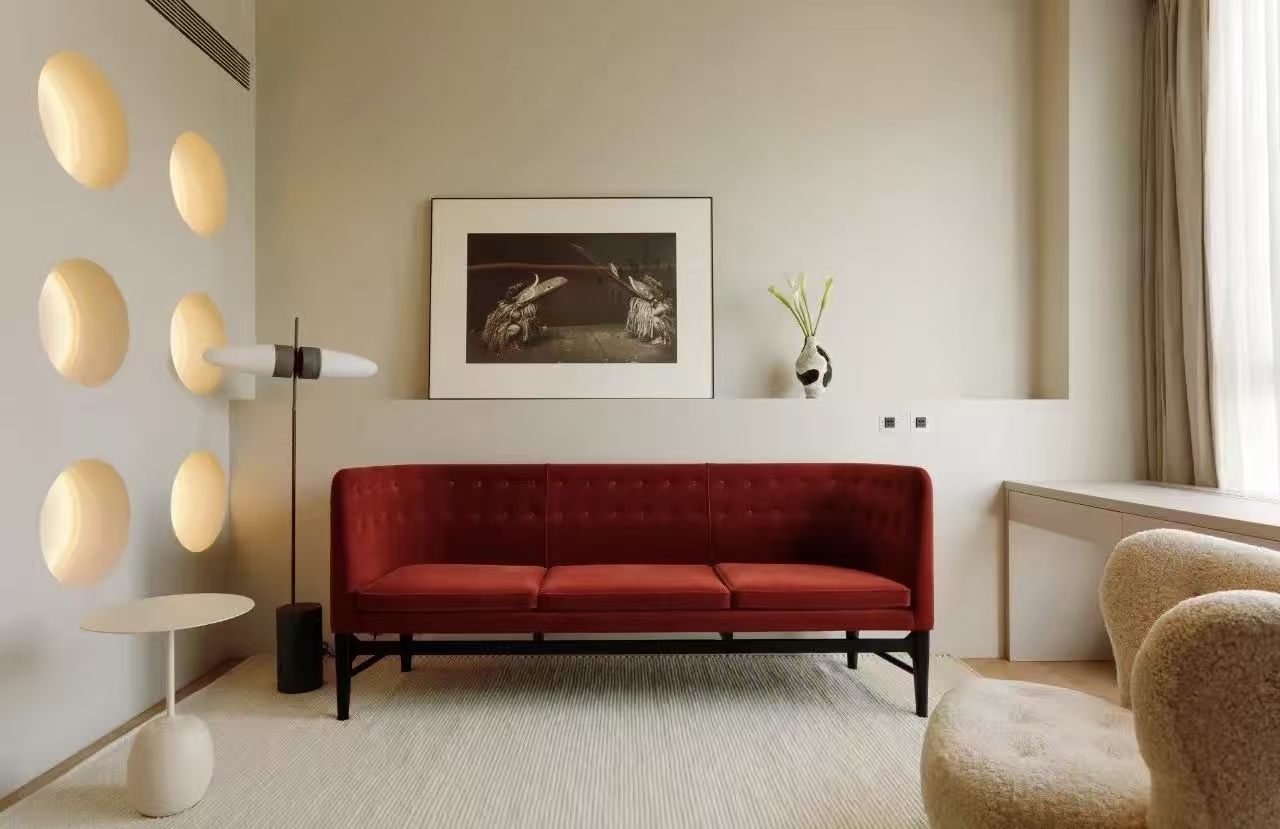 户型图进行空间重新划分,每个功能区各自独立,动线流畅。版本厨房和卫生间位置置换,让餐厅和厨房区域合并,扩大了空间也增加了利用率,另外将卧室设计在中间,客厅布置在采光最好的位置。 入户进门,低饱和度的墙面与地面,让小空间显得更加简约干净。 采光最足的客厅,整体以温柔奶白色为主,中间特意摆放一个暗红色的主沙发,让视觉更富有生机,瞬间活跃起来。 从客厅看去前方厨房,不一样的层高,在视觉上变得更有趣,打开灯光,让效果显得更温馨有层次,提升了整个空间的松弛感与氛围感。 在采光最好的落地窗前定制了一张长书桌,可以在家办公或阅读时使用,工作久了看看窗外,不会太过于疲惫。 餐厅和厨房并在一起做开放式设计。厨房的侧面墙全部错成内嵌式柜子,将冰箱、洗衣机、烘干机、收纳柜都纳入其中,隐藏起来。 厨房柜子选用不锈钢柜门,方便平时打理,将消毒柜也洗碗机也藏在不锈钢柜门里。 餐厅摆上黑色小圆桌,可以两三个人一起就餐。 穿过餐厨区就进入到了卧室的区域,左边是一整面墙的衣柜,右边就是卧室,两者之间通过亚麻材质的帘子做了隔断,平常将布帘拉上,就留出了独立的睡眠空间。 玄关的一侧就是卫生间,整体色彩与玄关保持一致。洗手台区域与里面马桶区,通过台阶高度差明确划分,让空间功能更清晰 干湿分离采用了透光不透视的玻璃门做分隔,定制的洗手台,斜面的下水口,视觉效果上简单利落, 卫生间再小,也做了一个泡澡浴缸,去除疲惫,提升幸福感。